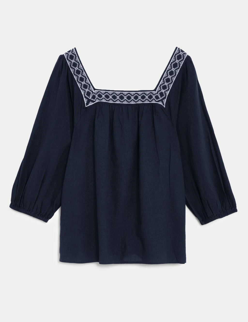 This airy linen-blend blouse has a timeless feel. Made to a comfortable relaxed fit, with voluminous short puff sleeves. Finished with an embroidered square neckline for a feminine feel.