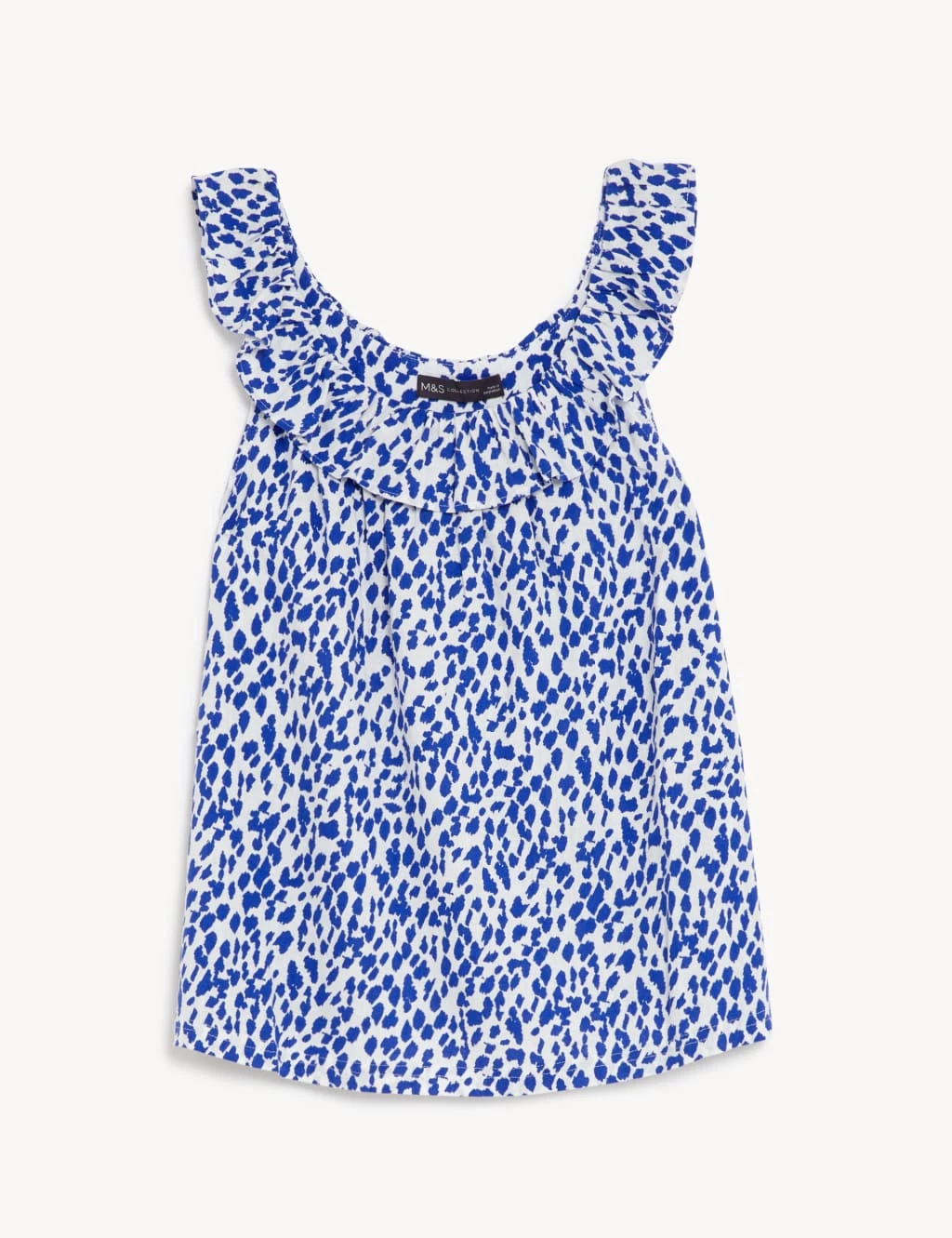 Made from an airy linen blend, this printed vest top is perfect for warmer days. The sleeveless design is cut in an easy regular fit with striking ruffle detailing at neckline.