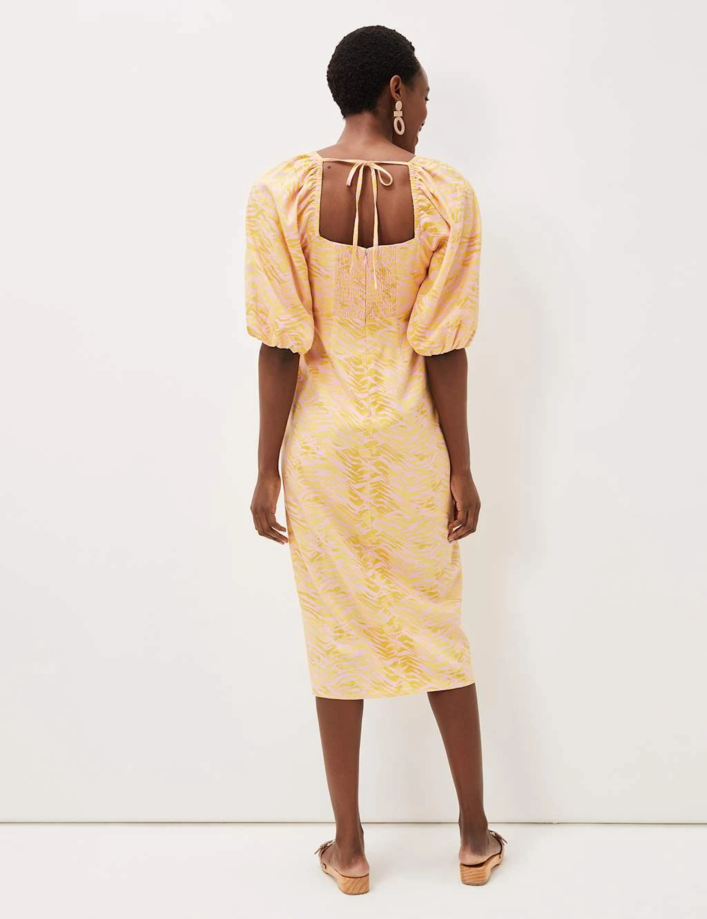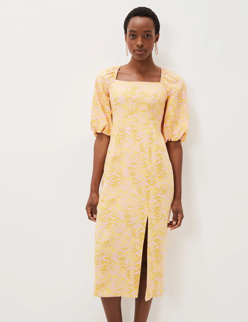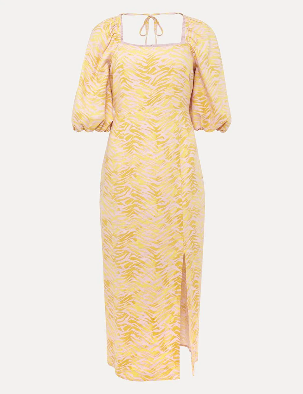 With striking zebra print, this linen blend dress from Phase Eight is a perfect choice for daytime occasions. It’s cut in a comfy regular fit, nipping in gently at the waist, and features a square neckline for a flattering look. The short sleeves are puffed for an on-trend silhouette. A tie at the back of the neck lends extra detail, and a shirred panel around the back zip fastening creates a vintage-inspired look. The straight skirt has a daring front split and finishes at a stylish midi length. This dress is fully lined for comfort.