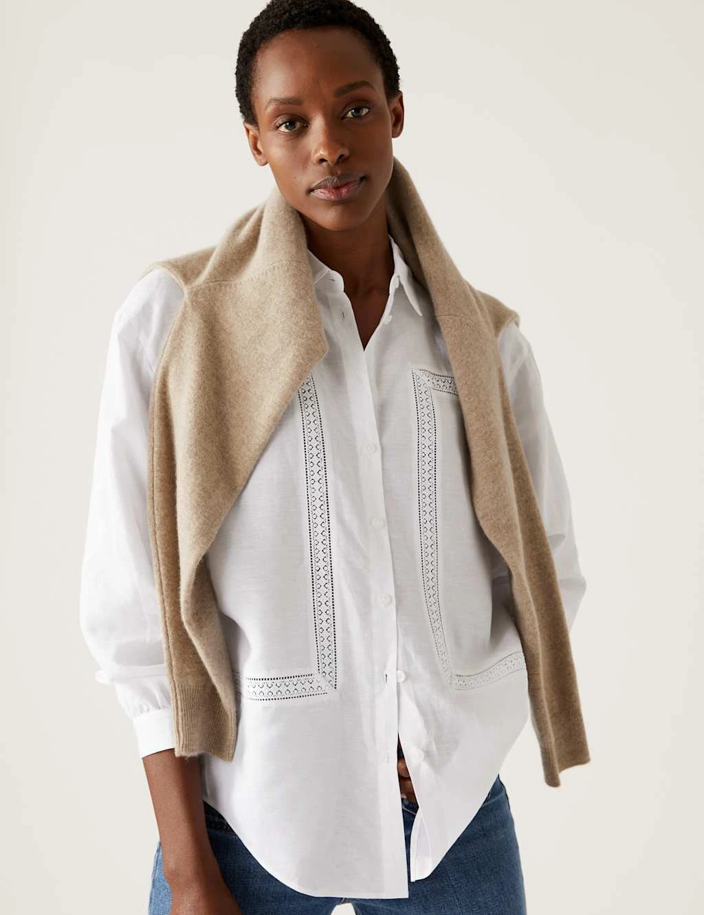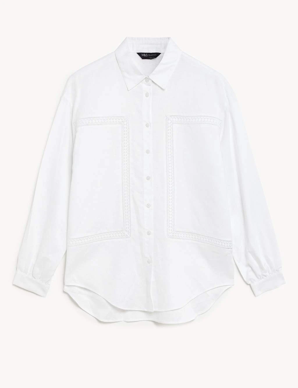 This simple, linen-rich shirt is subtly embellished with delicate lace inserts. Made in a regular fit, it features a curved hem so you can wear it tucked in or out. It has a classic smart collar and matching button-through fastenings. The long sleeves are slightly gathered and finish in narrow cuffs for a peasant-inspired touch.