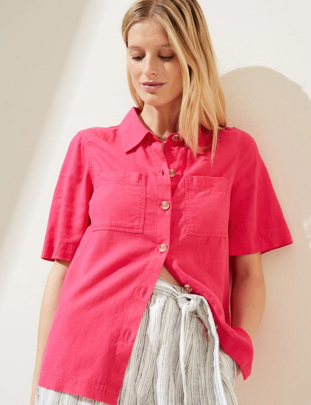 This breezy short-sleeved shirt is crafted from linen-rich fabric for a lightweight, breathable feel. It’s designed in a regular fit, with a button-through front and a neat collared neckline. Patch pockets add a utility feel.