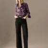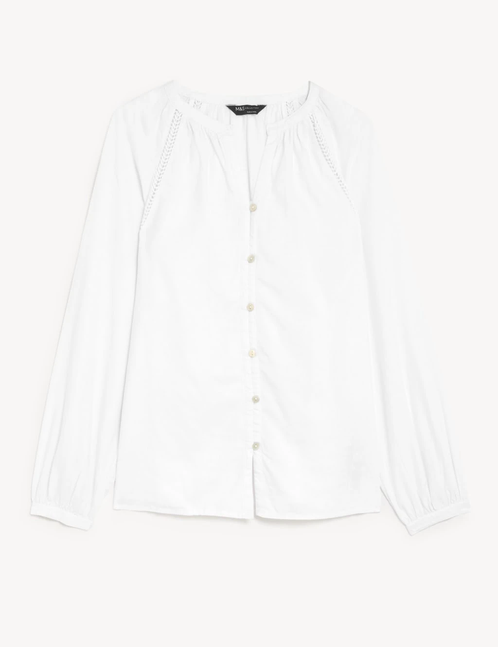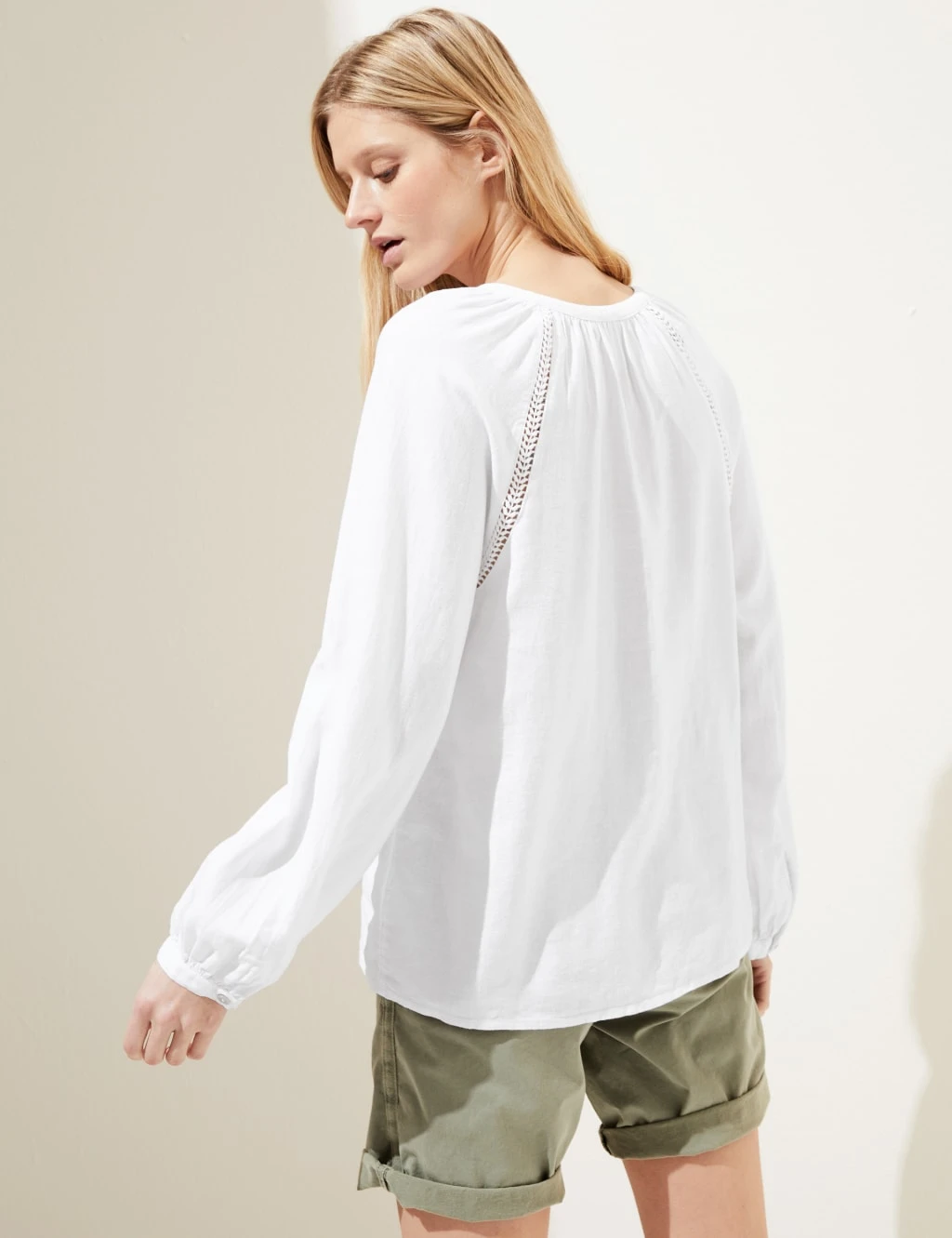 Breathable and lightweight, this linen-rich blouse is ideal for between seasons. Designed to an easy regular fit, it fastens with buttons up the front to a collarless v-neckline. Long sleeves are cuffed for a blouson effect. Ladder lace trims on the shoulders offer elevated detailing.