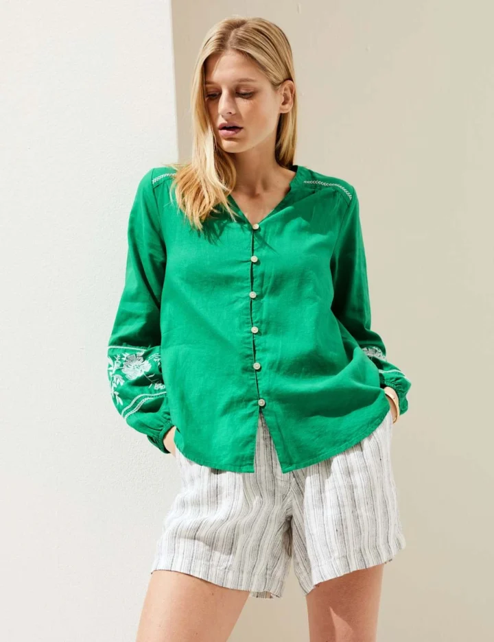 Contrasting embroidery brings a refined touch to this breezy linen-rich blouse. Regular fit, with airy long sleeves and a timeless v-neck. Button-down front for a smart finish.
