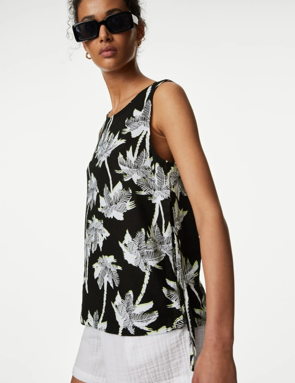 A statement print brings a bold feel to this linen-rich vest top. Cut in a comfortable regular fit, the sleeveless style has a high round neck and keyhole button fastening at the back. The split sides feature tie fastenings for an airy finish.