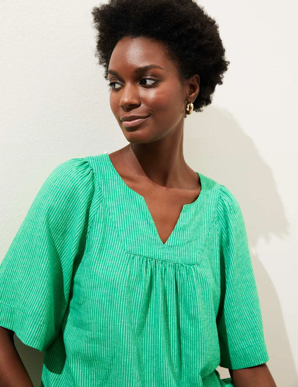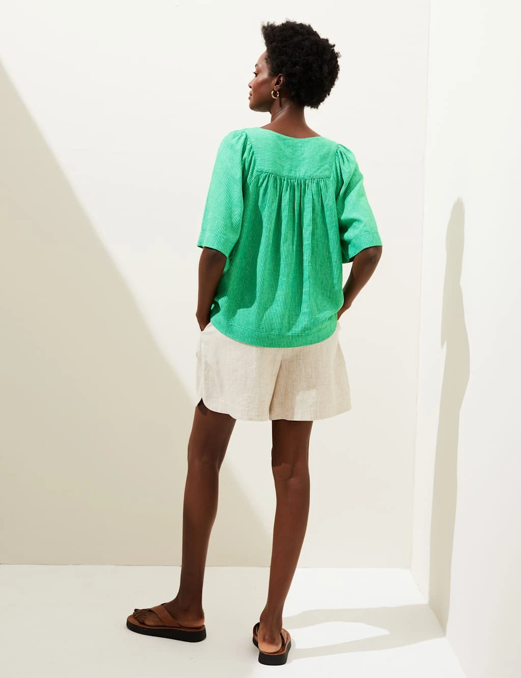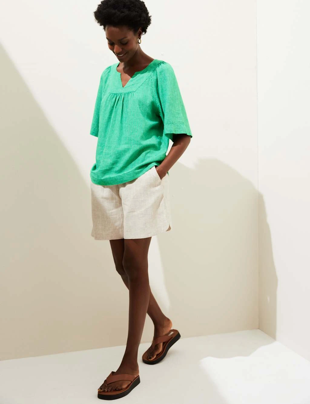 Crafted from breathable linen-rich fabric, this striped blouse will become a staple of your warm weather wardrobe. Regular cut with a notch v-neckline and short sleeves. Gathered detailing on the shoulders and yoke help create a laid-back look. Made with an easy-to-iron finish for quicker dressing.