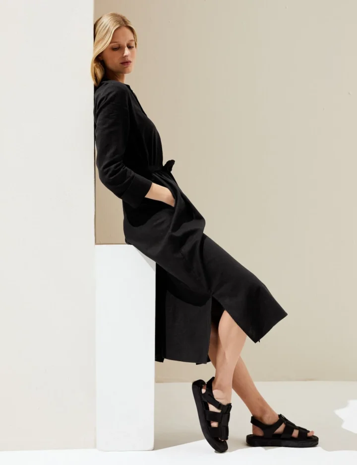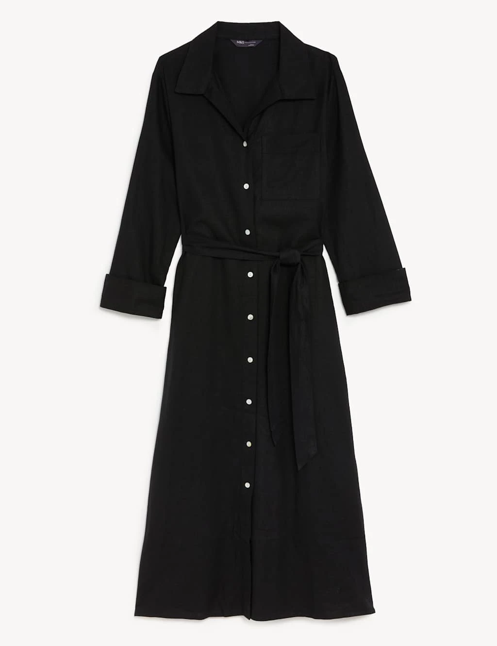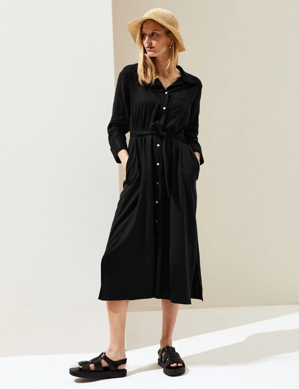 This dress is crafted from linen-rich fabric in a shirt style you can wear for any occasion. The midi-length piece is designed in a breezy relaxed fit with an optional belt to nip you in. An open-collared neckline, contrast buttons and turned-up sleeves lend a casual finish.
