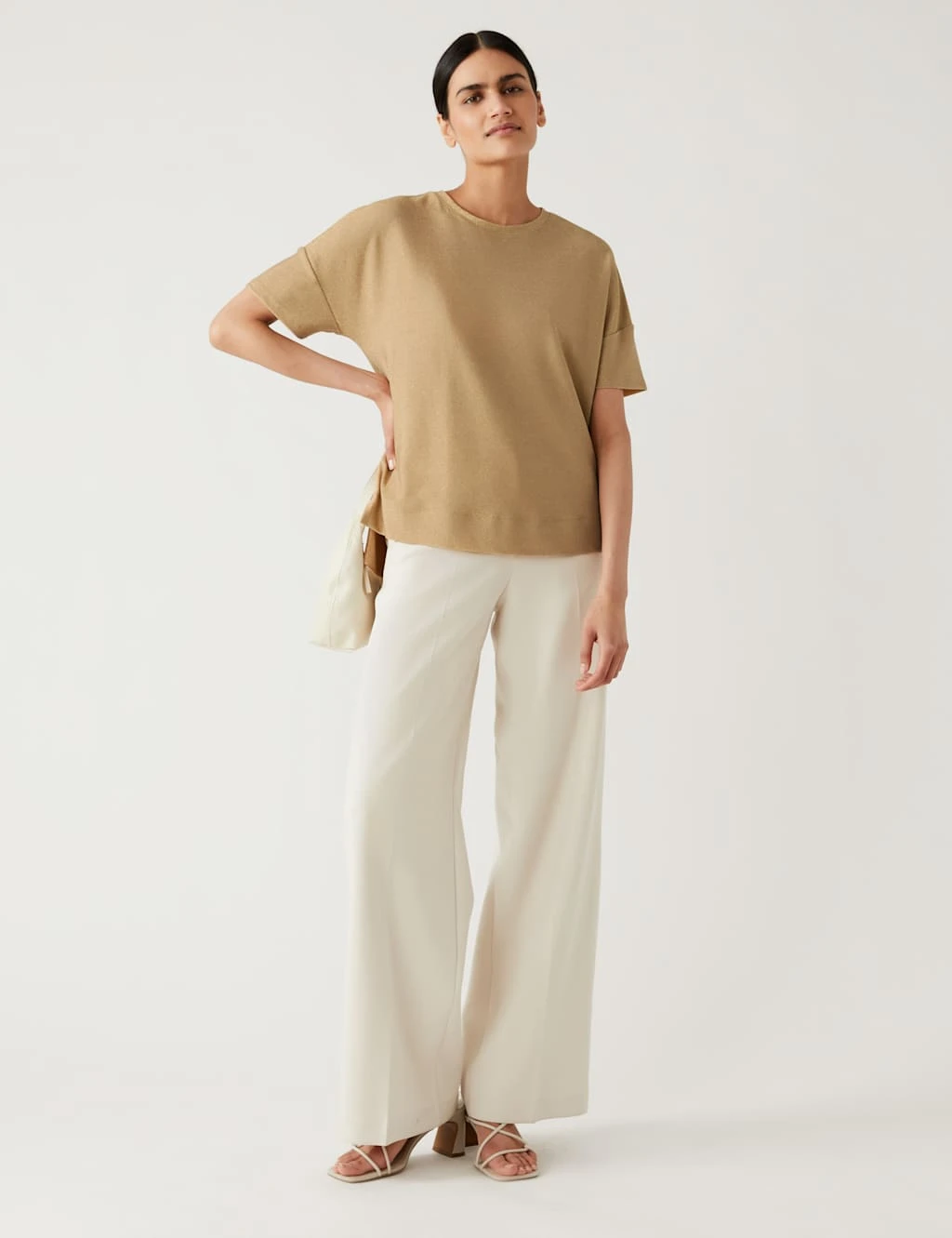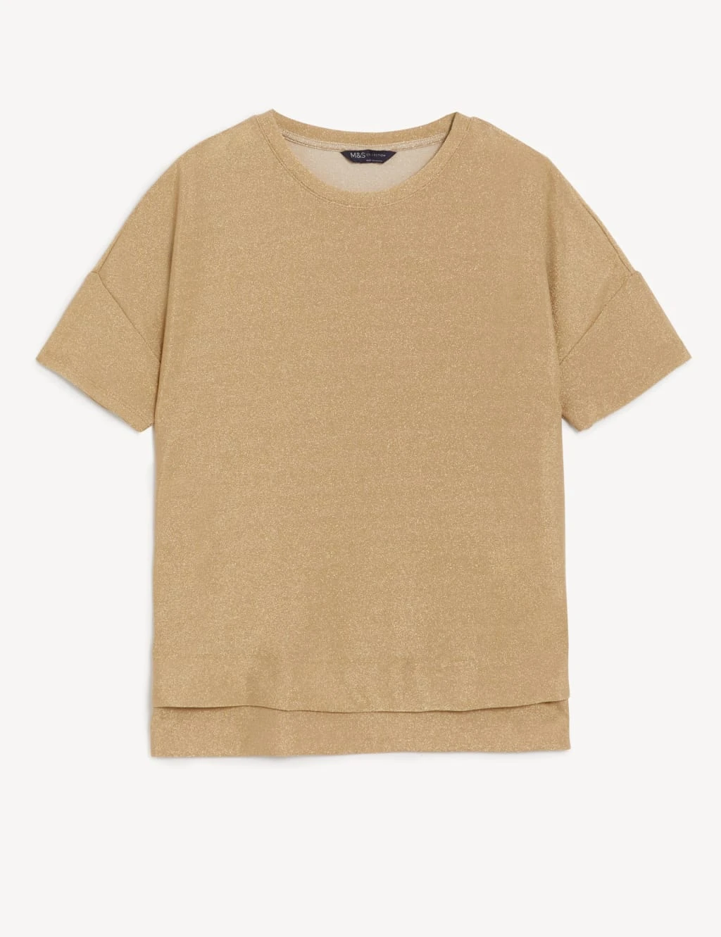 Add a touch of extra sparkle to your outfit with this Lurex top. It’s cut to a regular fit, with dropped shoulders and loose short sleeves. Added stretch in the fabric makes sure it holds its shape. The hem is longer at the back, and has subtle stitching for an extra pretty detail.