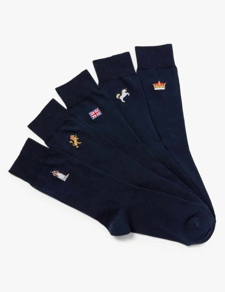 Celebrate the coronation of King Charles III with this pack of cotton-rich socks. Our Cool & Fresh™ finish fights the bacteria that can cause odours. Added stretch for comfort. Embroidered designs include a King Charles spaniel, lion rampant, Union Jack flag, unicorn and crown.