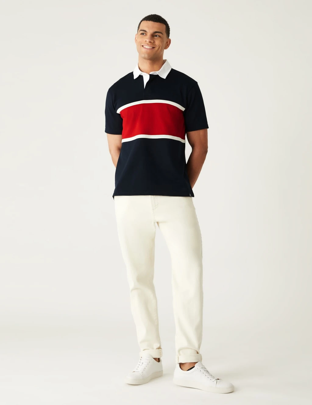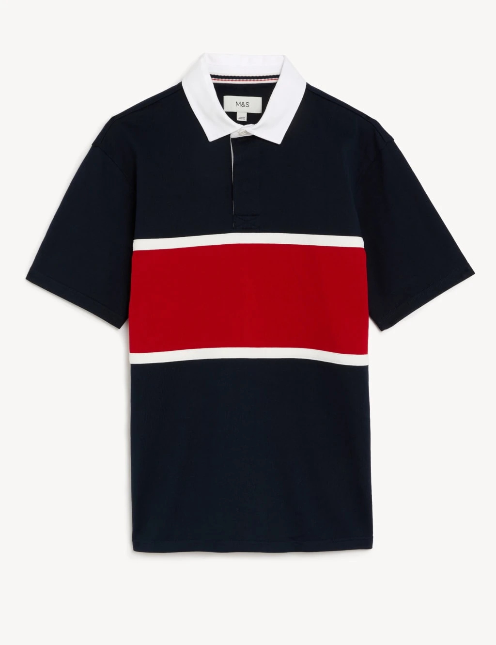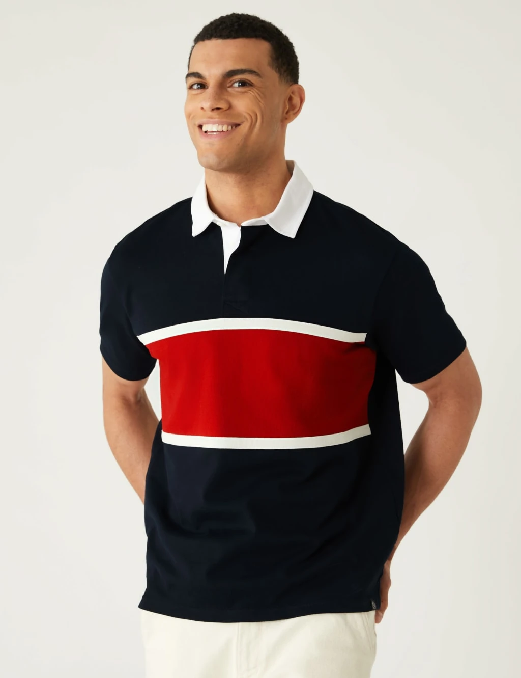 This short-sleeved rugby shirt is ideal for casual days out. Made to a regular fit. Classic collar and chunky colour block stripes give it an authentic sporty look. Made from breathable pure cotton to keep you cool and comfortable.