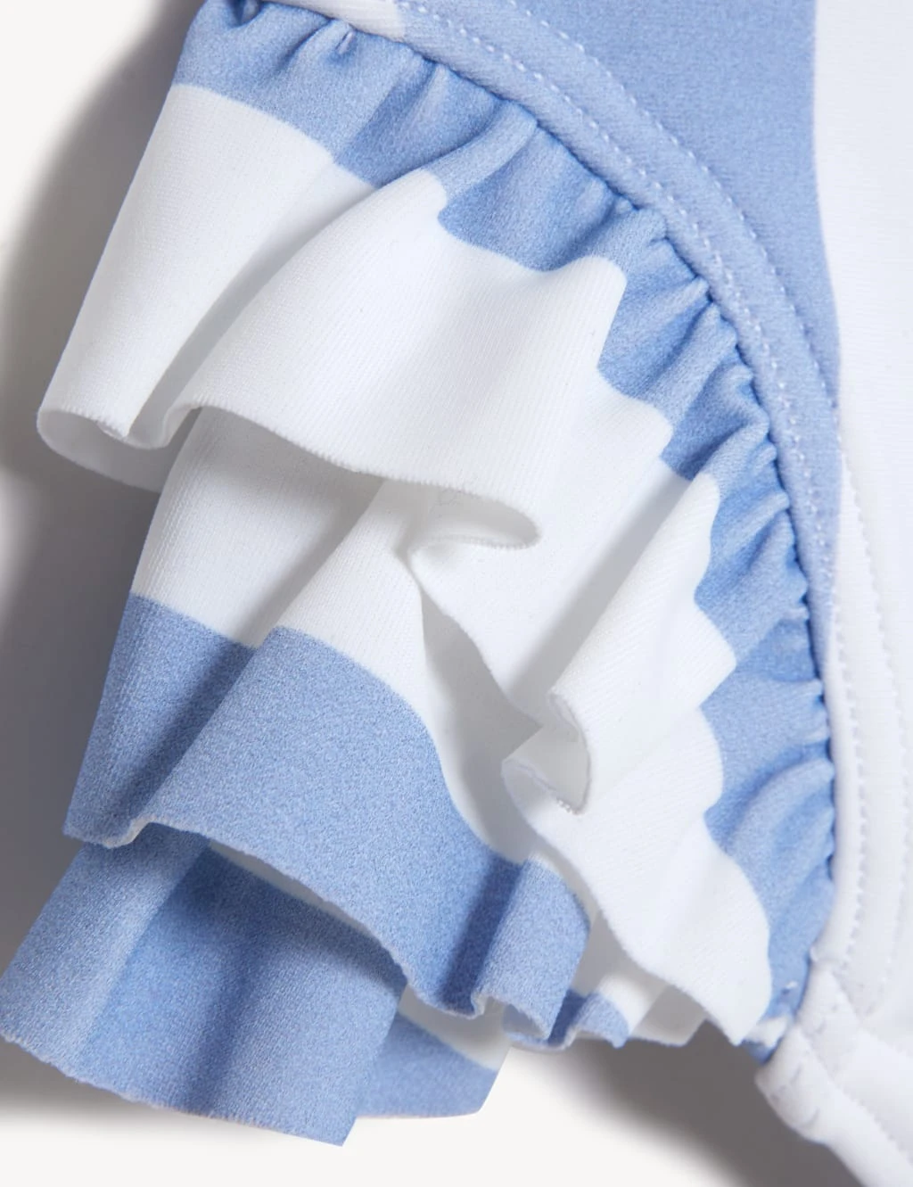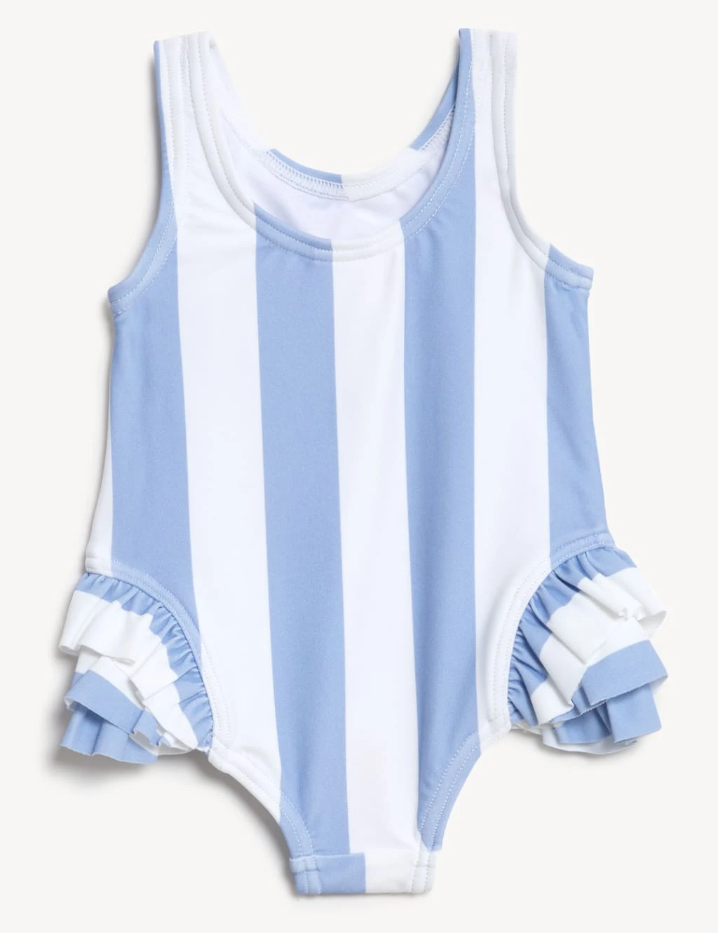 Kids can enjoy splashing around in this sweet swimsuit, featuring a playful Minnie Mouse™ graphic. It’s chlorine-resistant and endorsed by the British Skin Foundation for its built-in Sun Smart UPF50+ protection. The striped design features pretty ruffles on each leg.