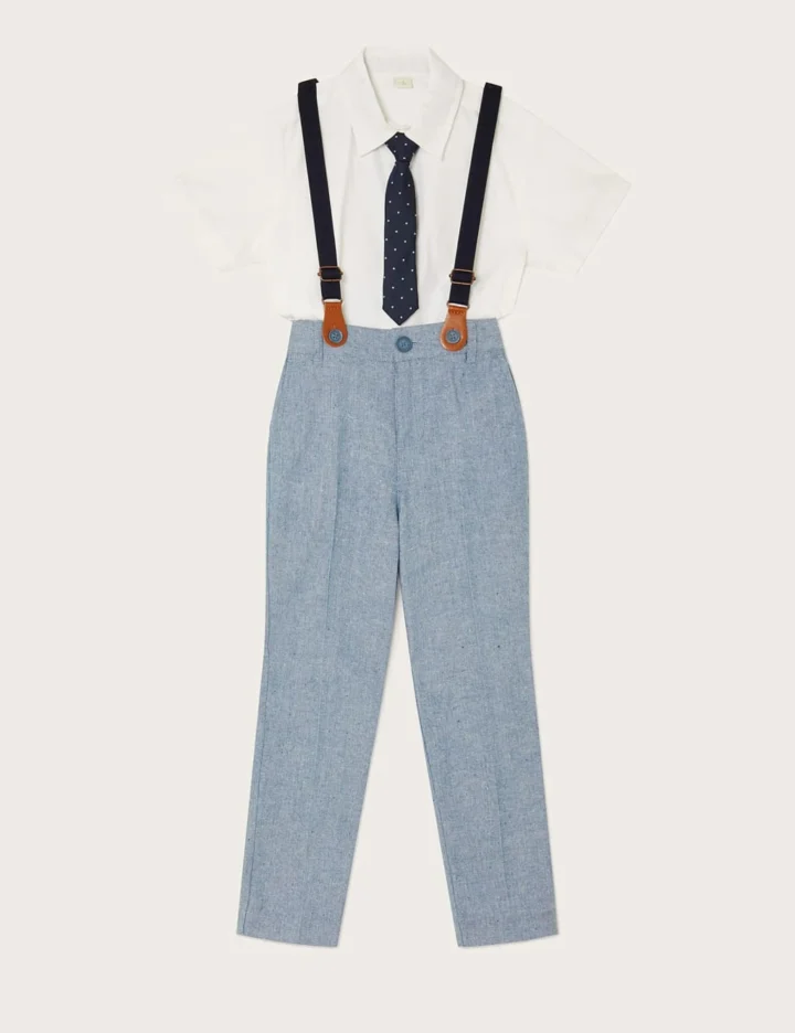 Youngsters will look smart and stylish in this four-piece set from Monsoon. It’s made to a regular fit and includes a pure cotton short-sleeved shirt and a tie decorated with classic polka dots. Braces attach to the trousers which feature neat creases for a tailored touch. An elasticated back waist ensures a comfy fit.