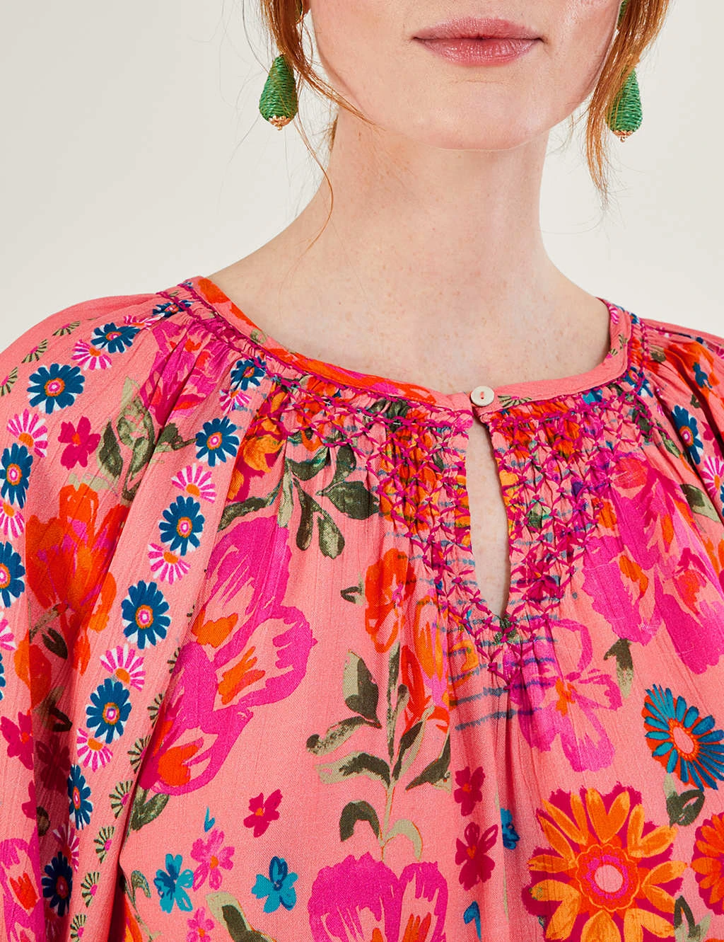 A bright floral print helps this Monsoon blouse create a summer-ready vibe. It’s crafted in a regular fit from lightweight fabric for breathability. Shirring and a button fastening at the round neck create a dainty look, while 3/4 length blouson sleeves provide a feminine flourish.
