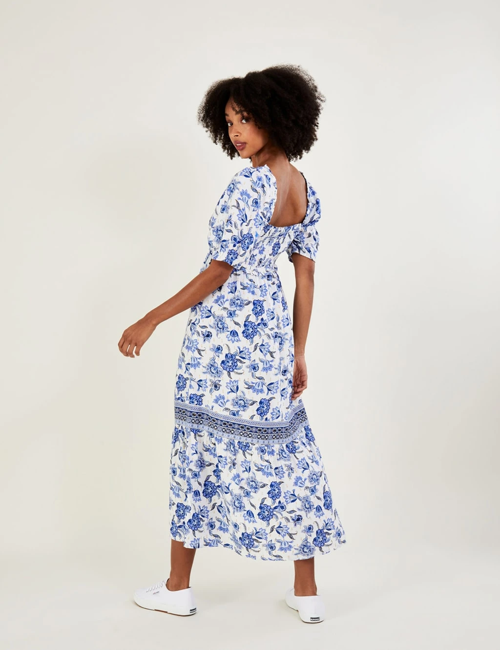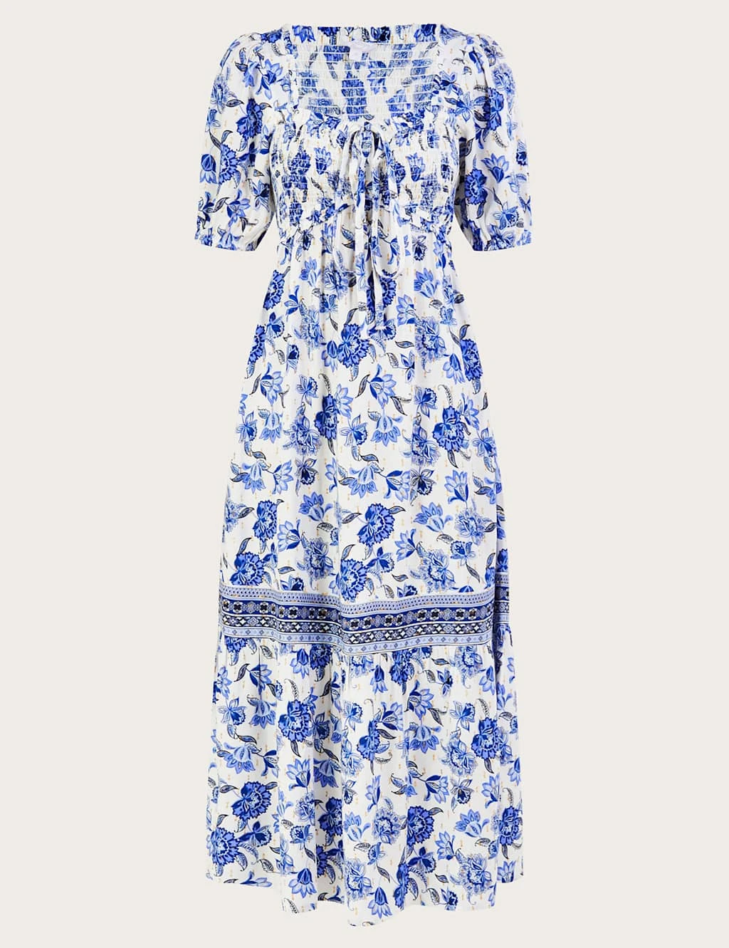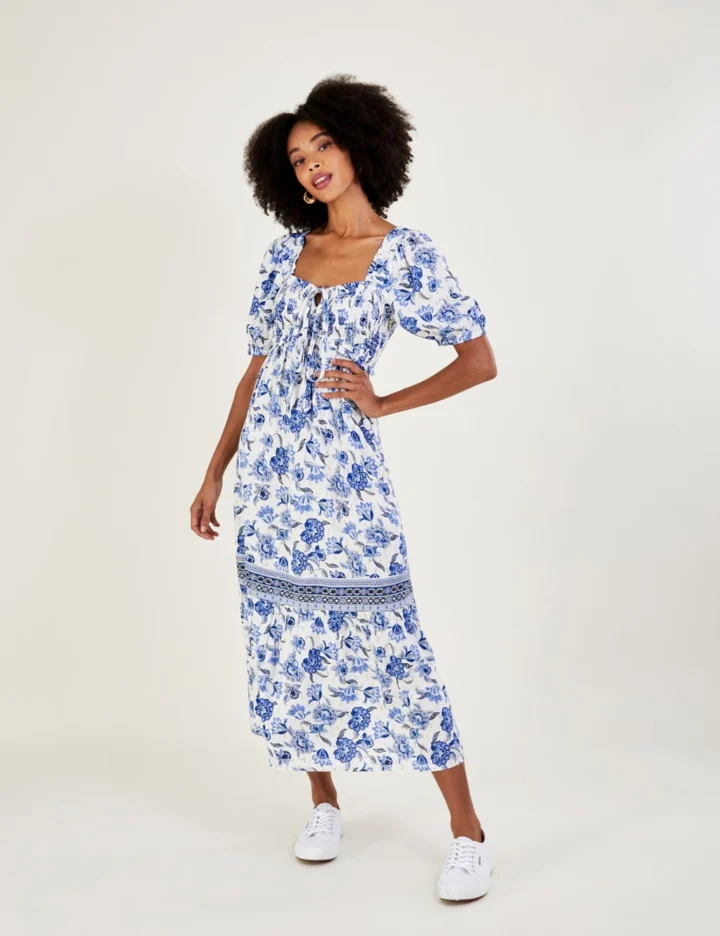Bring a fresh feel to your laid-back style with this floral midaxi dress from Monsoon. It’s cut to a comfy regular fit in a tiered style for a flowing, feminine silhouette. Tie detailing on the square neck and the flexible shirred bodice add extra shaping for a flattering look.