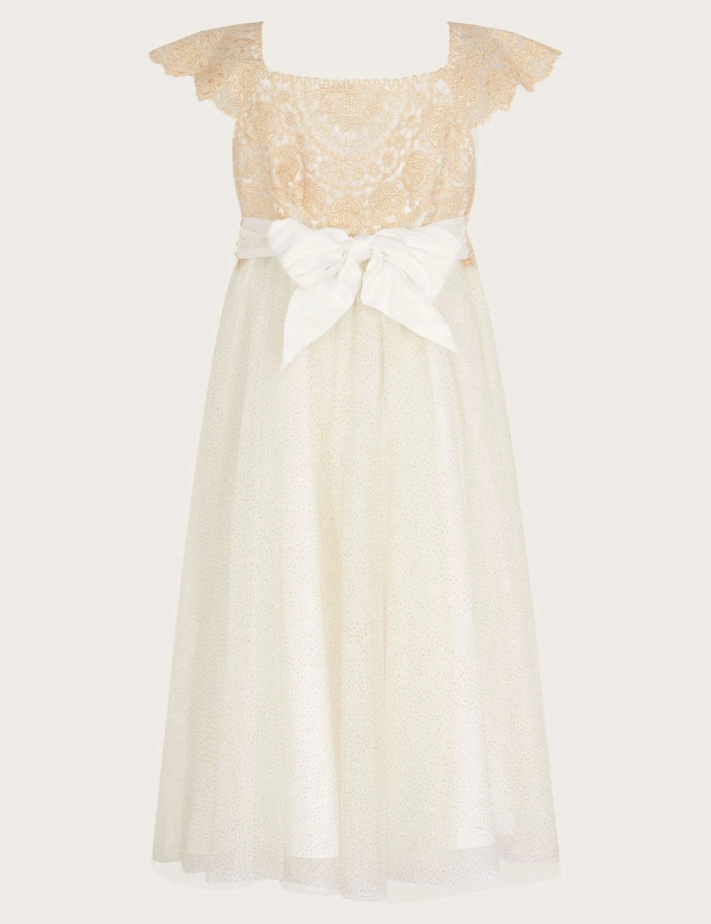 See her shine in this shimmering Monsoon dress, the perfect pick for parties and other special occasions. It’s designed in a regular fit, with short sleeves and a bodice crafted from metallic lace. A full skirt of glitter mesh creates a cascade of sparkles that will catch the light as she moves. The piece features a full lining to keep them comfy and is finished with a pretty satin bow at the back.
