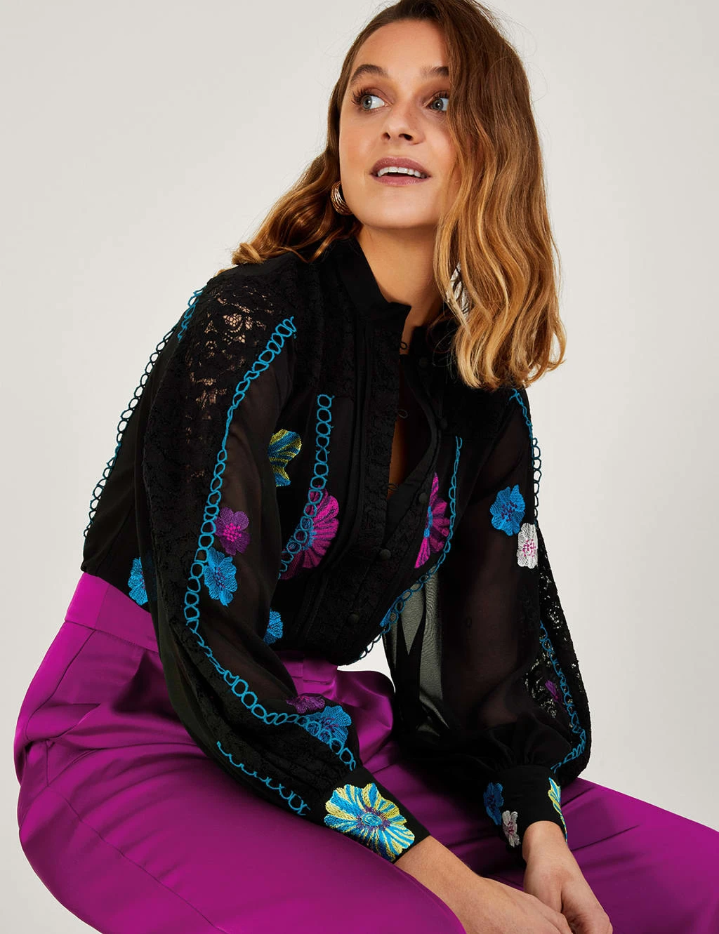 This striking blouse by Monsoon will create a look for both work and play. It’s crafted in a regular fit, with a high neck for an elegant profile. Lace detailing runs through the shoulders and long sleeves to create a dainty effect, accentuated by bright embroidered flowers. A decorated button placket gives a neat finish.