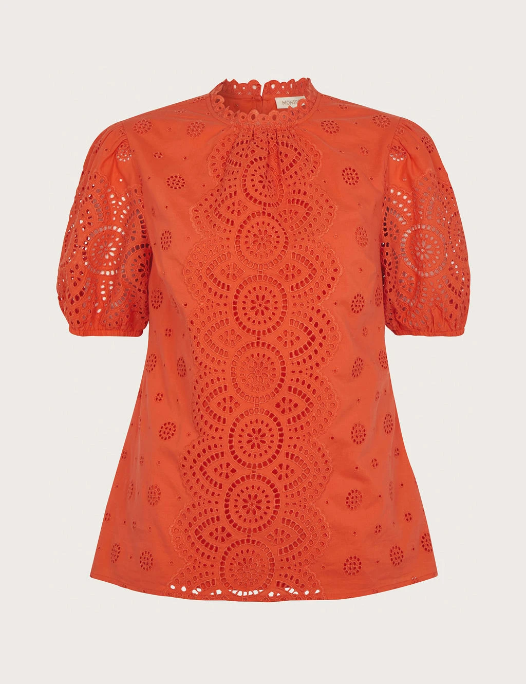 Choose this organic cotton cutaway blouse from Monsoon for bold summer style. It’s made in an easy relaxed fit with a pure cotton lining for comfort. The scalloped high neck adds a sense of femininity, while short puff sleeves with stretchy cuffs create gentle volume. This versatile piece features a keyhole back with a button closure.
