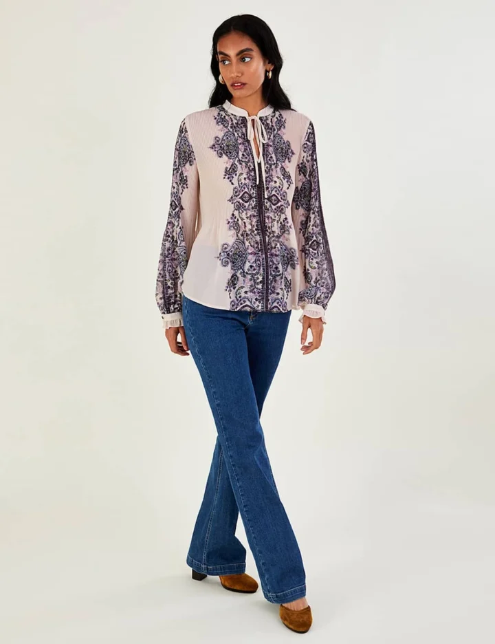 Add an elegant touch to your ensemble with this striking blouse from Monsoon. It’s cut to a regular fit and features an intricate print down the centre and on the long sleeves for a standout look. All-over pleats add movement and texture, while a pussybow tie at the v-neck offers a dainty finish.