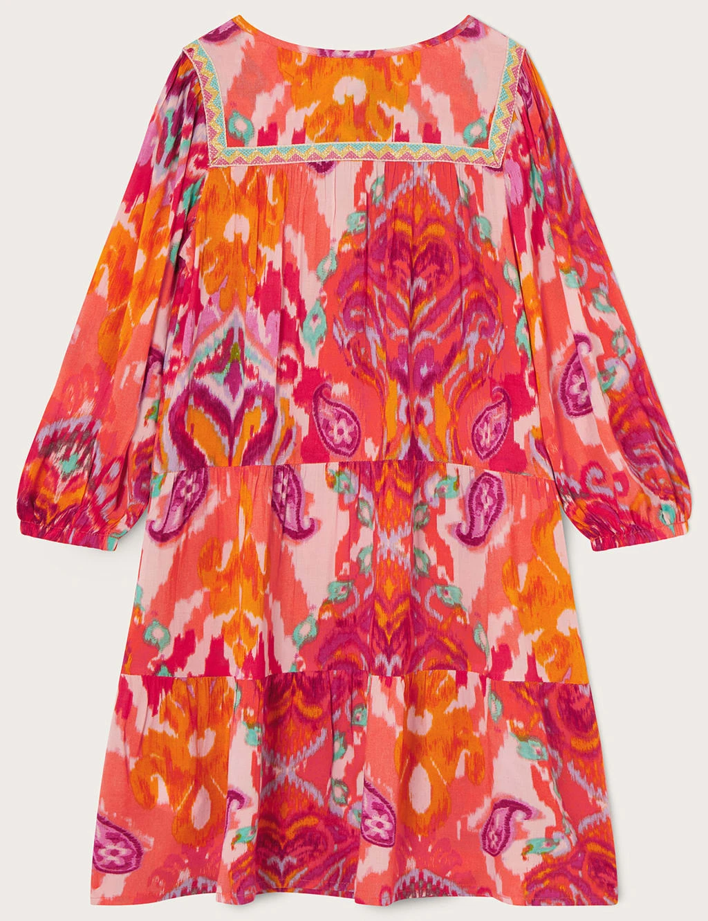 Bright and beautiful, this paisley print smock dress from Monsoon is ideal for warm-weather occasions. It’s made to a comfy regular fit and features a notch v-neckline, as well as pretty embroidered tape on the bib. With its gathered blouson sleeves and gently tiered skirt, this dress has a breezy silhouette that’s perfect for swishing in.