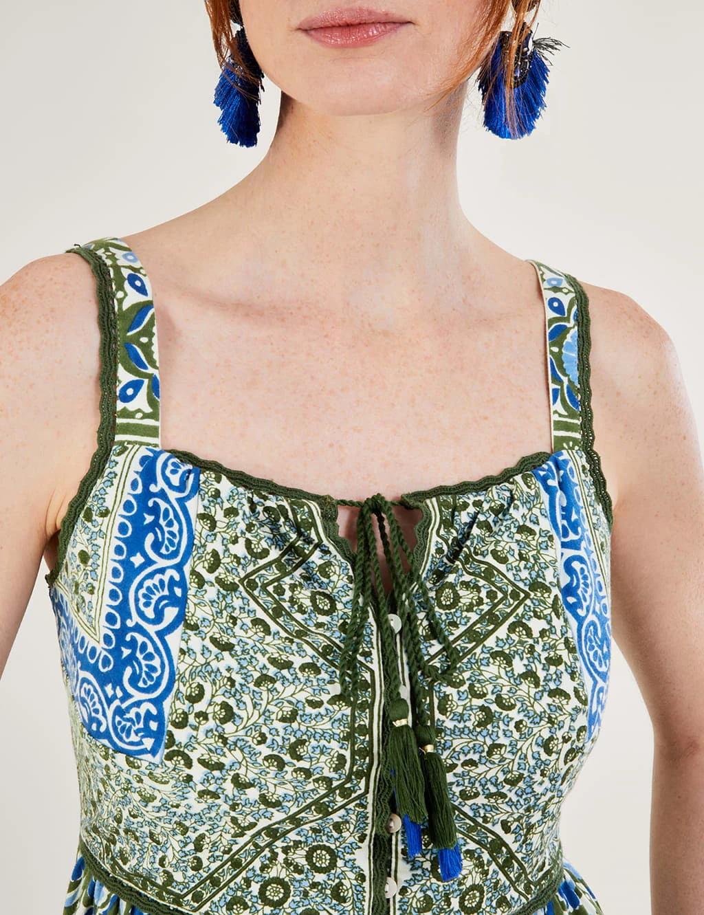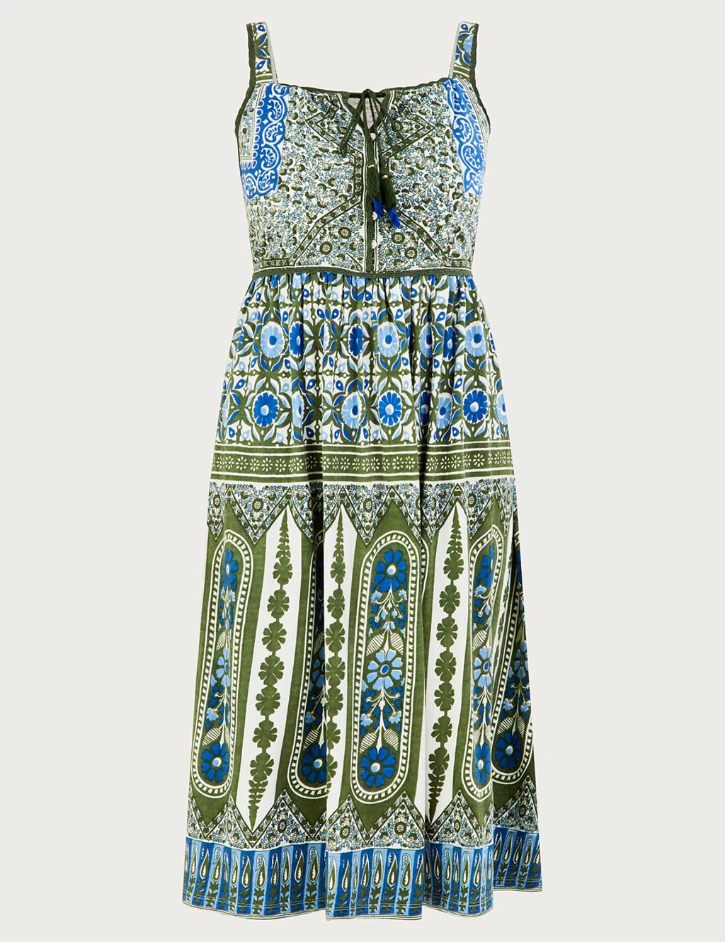 A detailed heritage print gives this Monsoon swing dress a striking look. It’s crafted in a regular fit from pure cotton for a breathable feel in balmy weather. The strappy square neckline features a tassel tie that adds playful detail, while knitted trims accentuate the artistic effect. This stand-out summer dress is complete with a midi-length hem and a button fastening at the front.