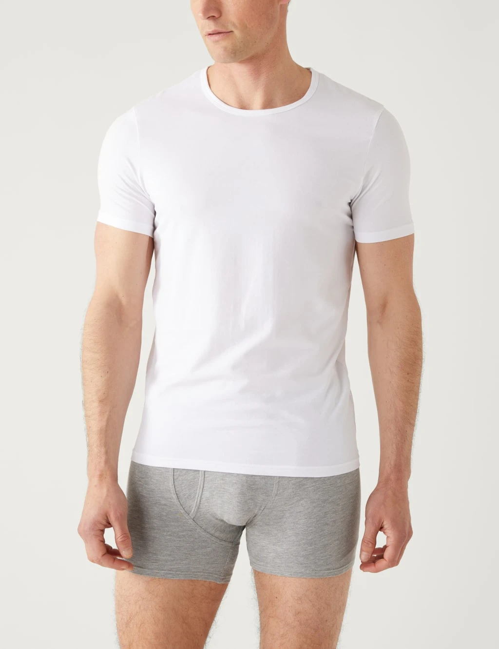 This pack of five breathable, cotton-rich vests will add an extra layer of comfort to your day. Regular fit t-shirt style, with short sleeves and a round neck. Made with multi-directional four-way stretch for ease of movement. Our clever Cool & Fresh™ technology draws moisture away from the skin, for an antibacterial and moisture-wicking finish that’ll keep you feeling fresh all day. We only ever use responsibly sourced cotton for our clothes.