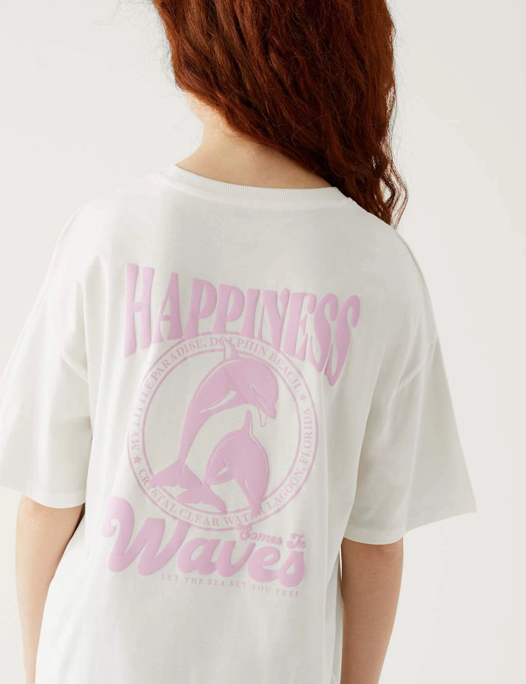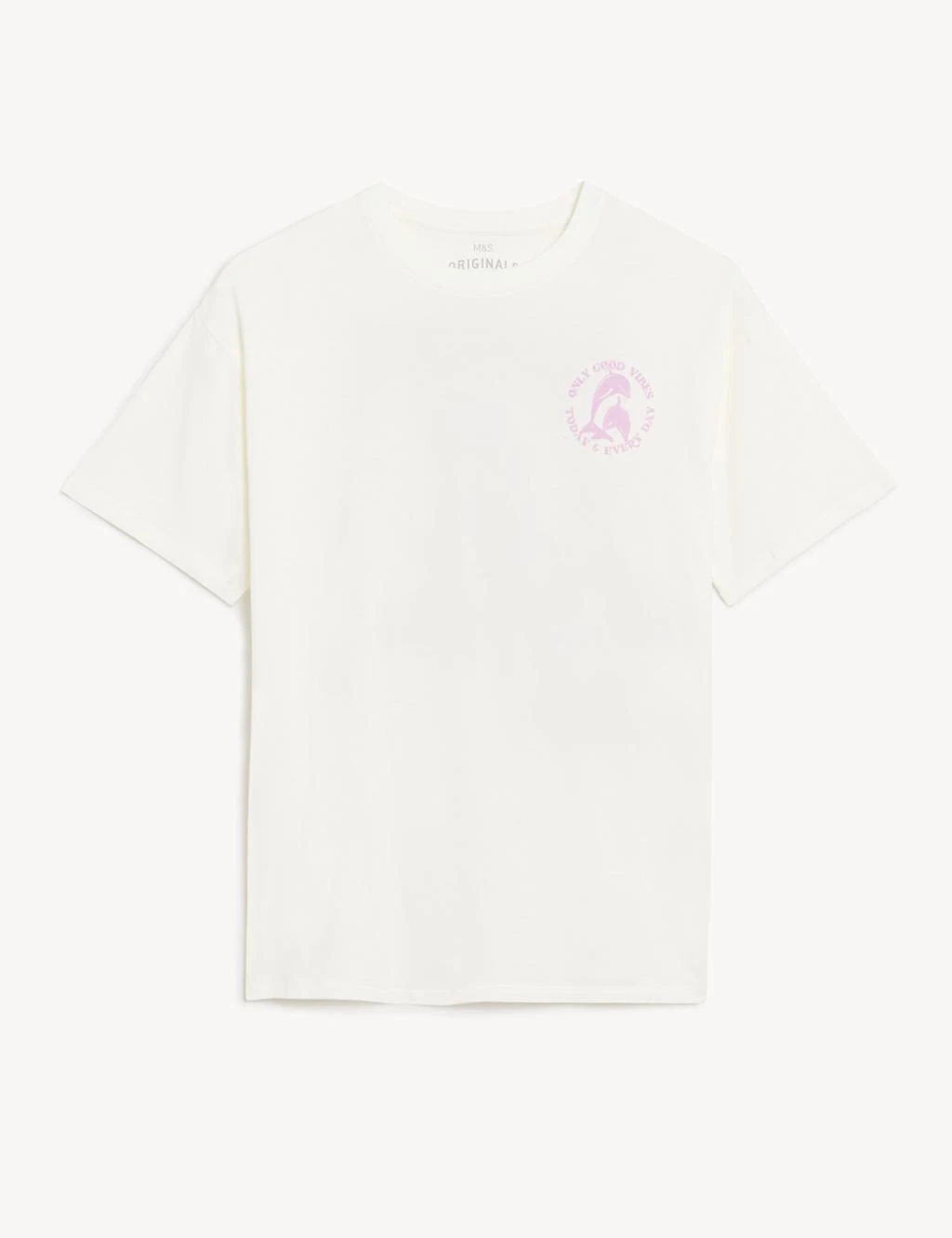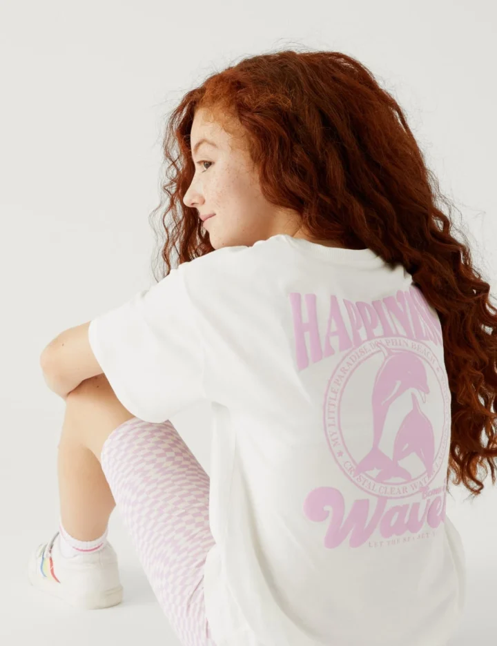 Freshen up their casual wardrobe with this cool, pure cotton t-shirt. It’s cut in an oversized, longline fit with a round neckline for comfy all-day wear. Finished with two playful jumping dolphins and the slogan ‘Only good vibes today & every day’.