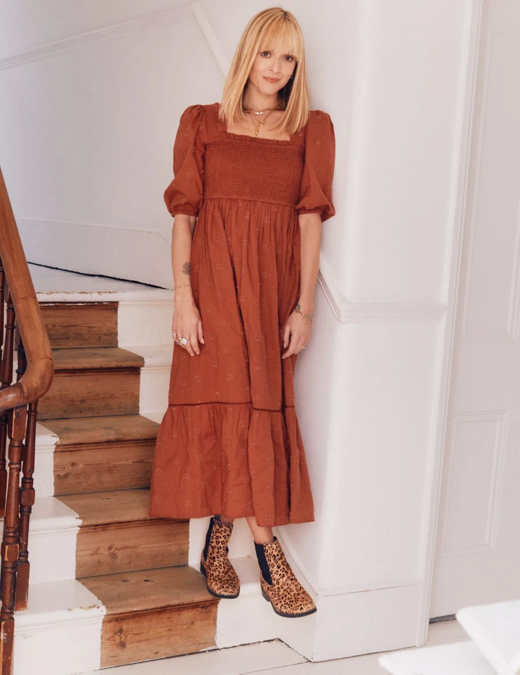 Summer days call for this breezy organic cotton tea dress from Nobody’s Child. It’s designed in a fitted shape with a shirred bodice and a tiered midi-length hem. This effortless style features tonal all-over floral embroidery and short sleeves with stretchy cuffs to hold them in place. The square neckline and back are finished with playful frilled trims.