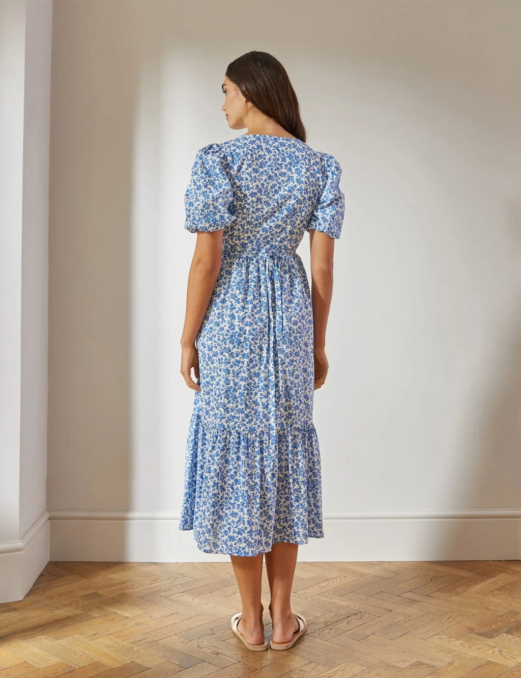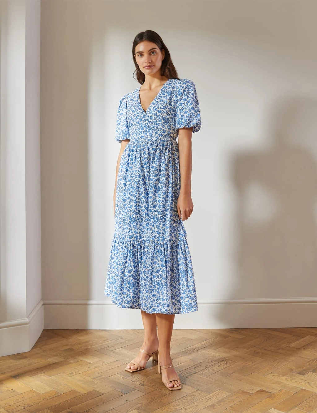 Add some romance to your wardrobe with this organic cotton wrap dress from Albaray. Designed to flatter, this midaxi style has a waist-enhancing seam and side tie fastening, plus an elegant v-neckline. Printed all over with a feminine rosebud design, it has short puff sleeves and a tiered hem for a playful feel.