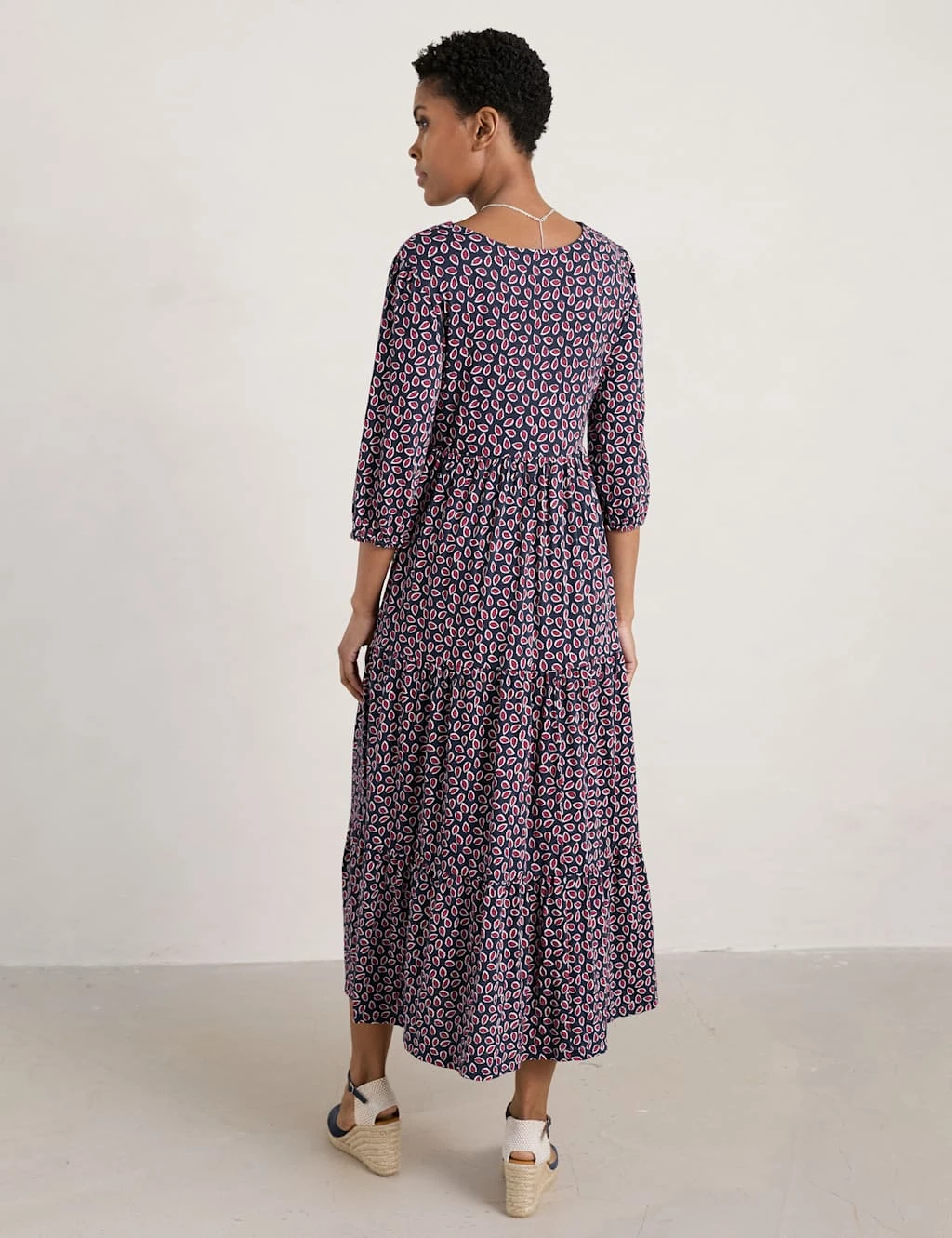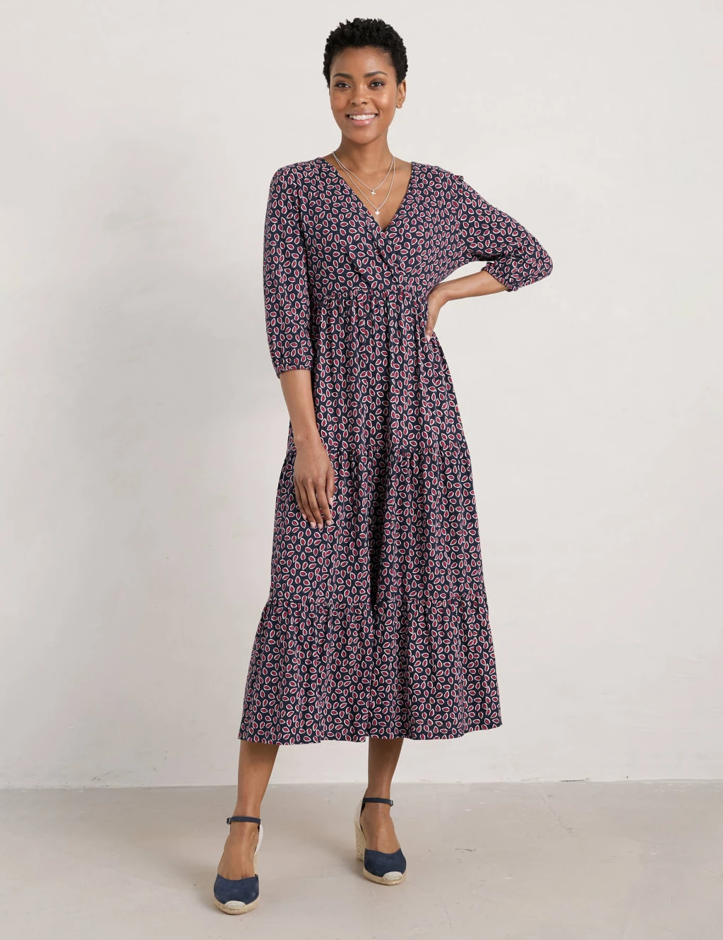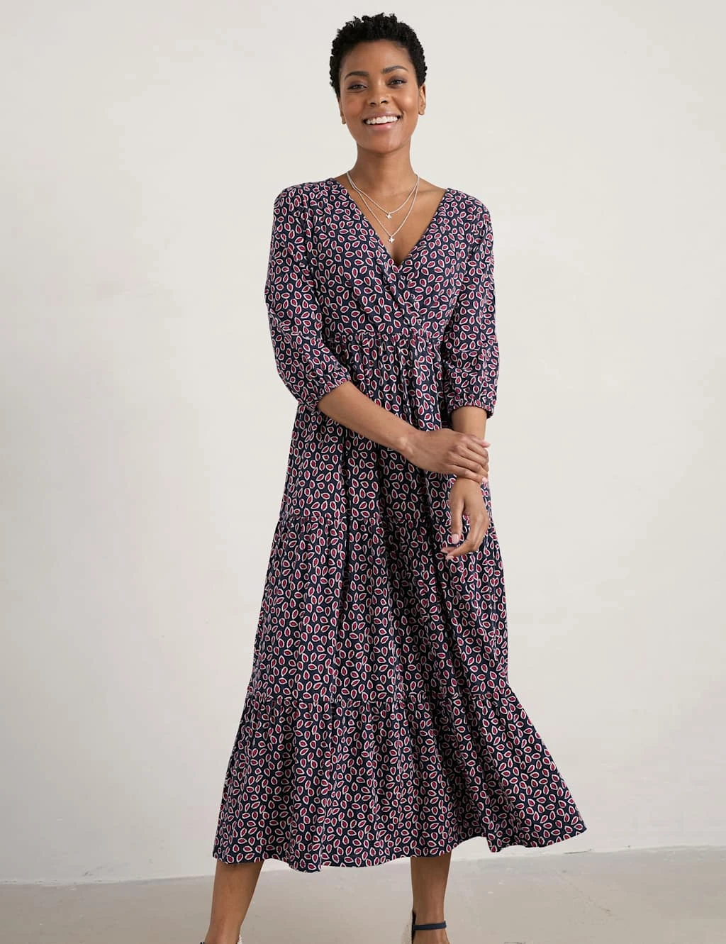 If you love a full, swirly skirt, try this striking leaf print midi dress from Seasalt Cornwall. It’s made in a regular fit from pure organic cotton, with a midi-length skirt that’s made up of deep, gathered tiers. The wrap-style top has a v-neckline, which curves into a scoop neck at the back. Three-quarter sleeves with gathered cuffs complete the charming design.