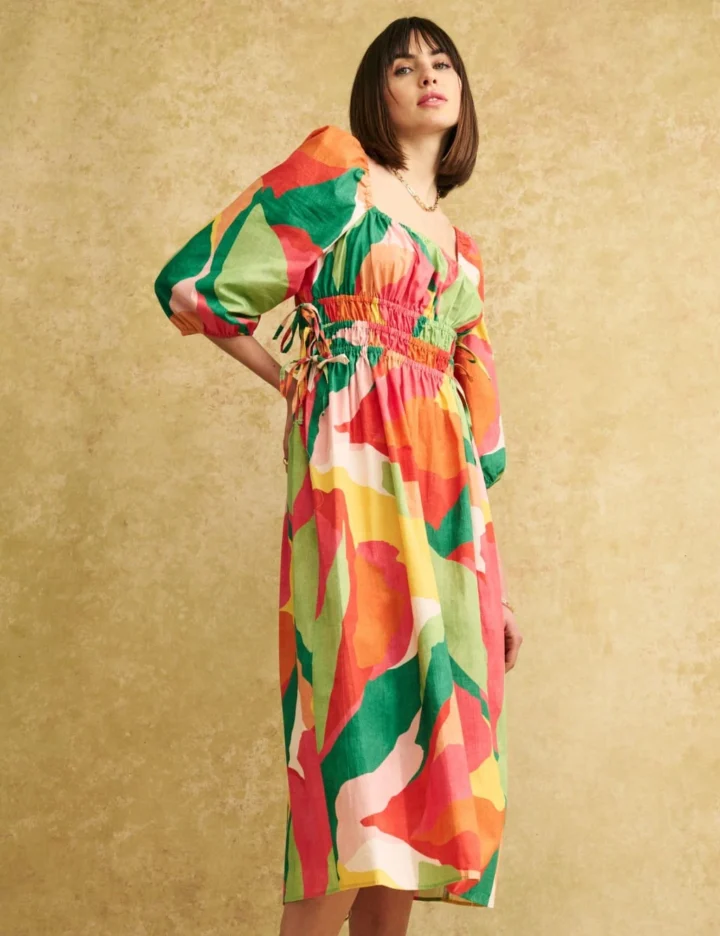 With its bold print and flattering shape, this midi waisted dress by Nobody’s Child is a summer staple. It’s fitted for a flattering look and feel, with an elasticated waist panel for comfortable wear. The square neckline and back add a modern touch, along with statement puff sleeves and tactile tie detailing.