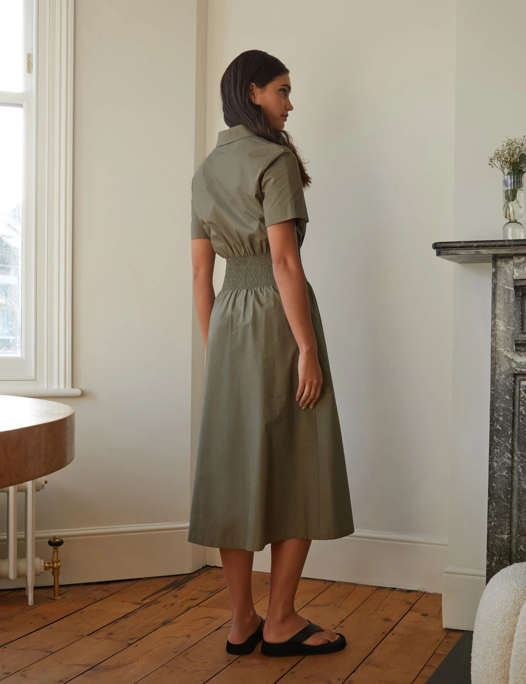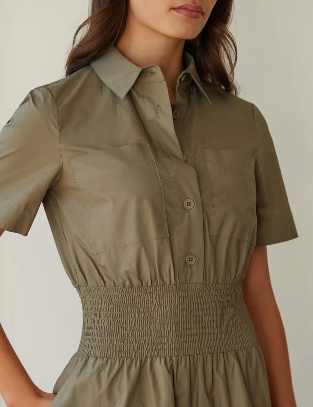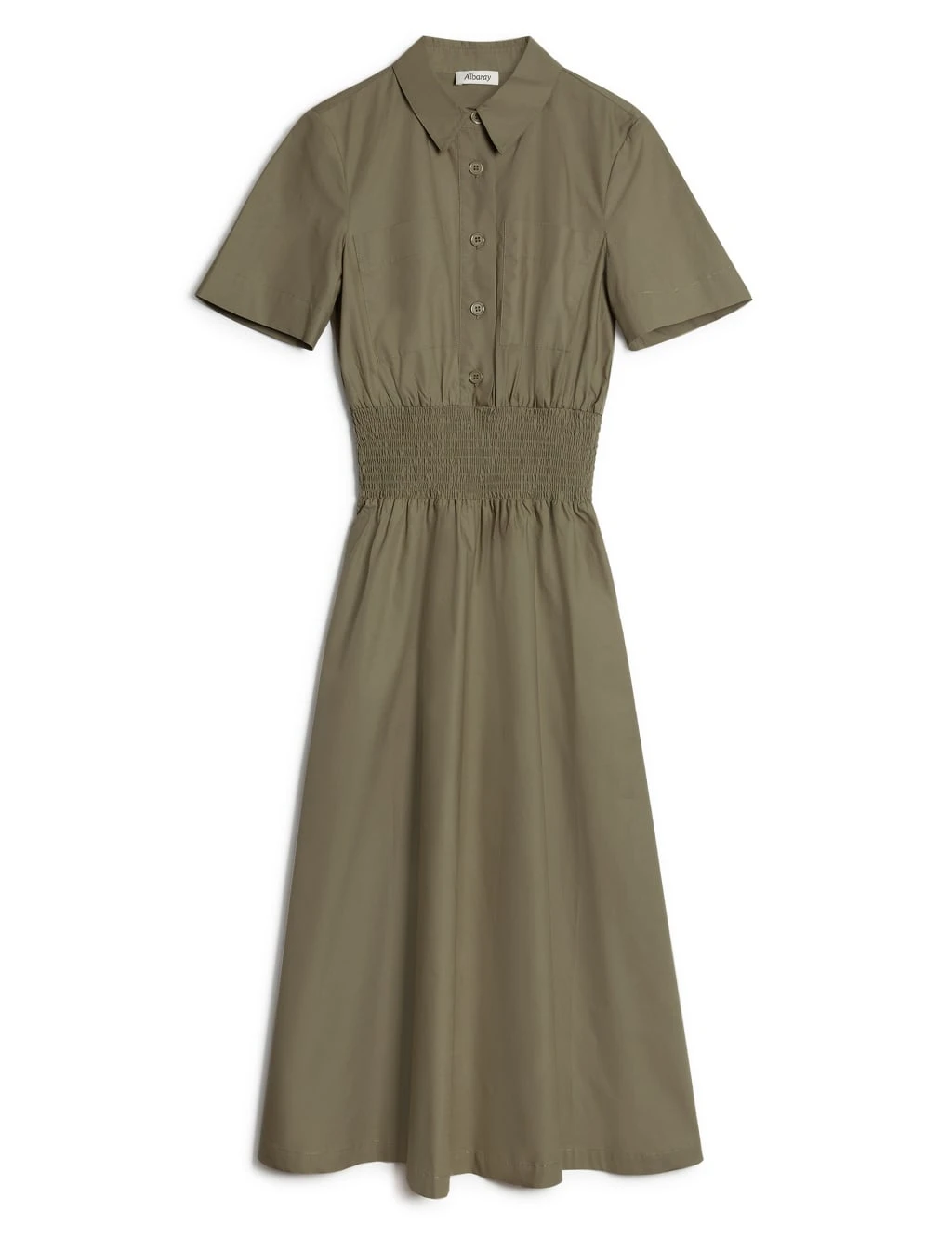 From Albaray, this crisp organic cotton shirt dress is defined by smart-casual style. It’s cut to a regular fit with a collared neck and a flattering shirred waist. The short sleeves add a breezy feel, while two chest pockets create a utilitarian aesthetic. This piece sits at a classic midaxi length.