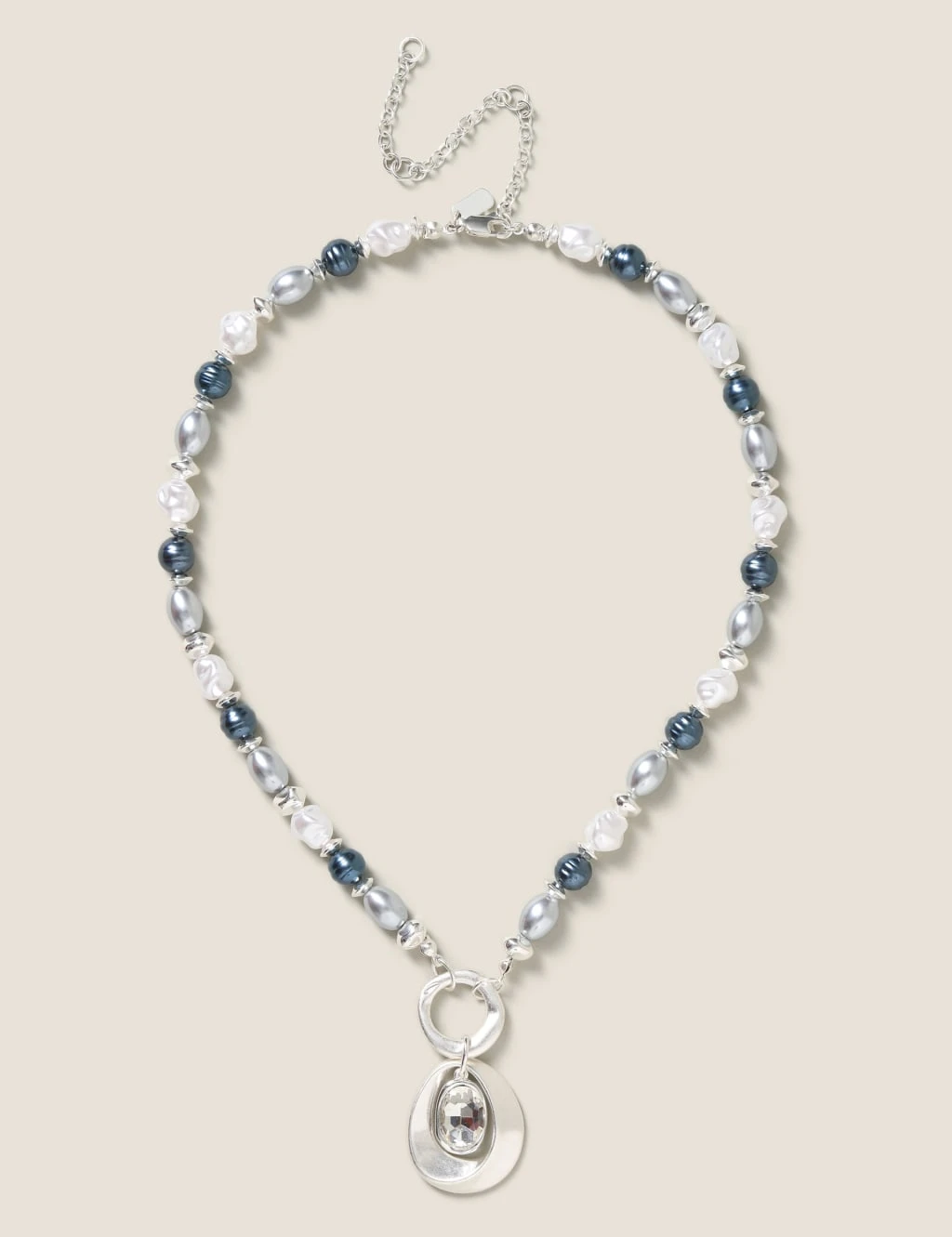 This gorgeous mix of blue and white pearl beads finished with an oval pendant is the perfect necklace for your everyday look. The delicate materials paired with the bold pendant make for a modern, contemporary finish.