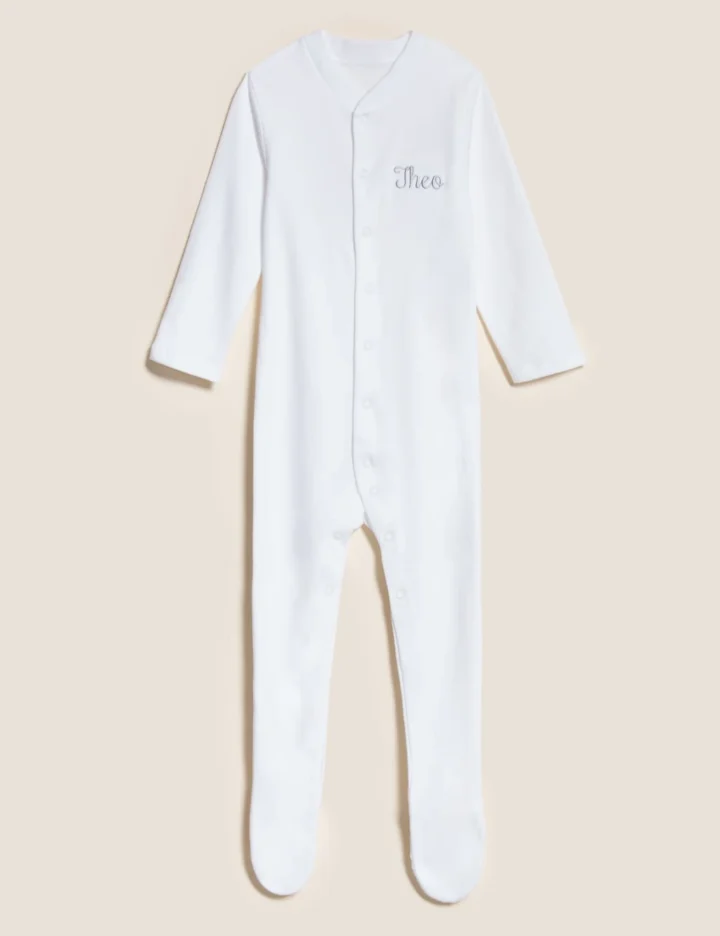 Welcome new arrivals in style with this personalised pure cotton sleepsuit, embroidered with baby’s name in grey thread. Popper fastenings make dressing and changing easier. Sizes up to 3 to 6 months have integral scratch mitts, while sizes from 9 to 12 months have anti-slip technology on the feet. Babysafe toes keep them comfortable, and flat seams are gentle on delicate skin.
