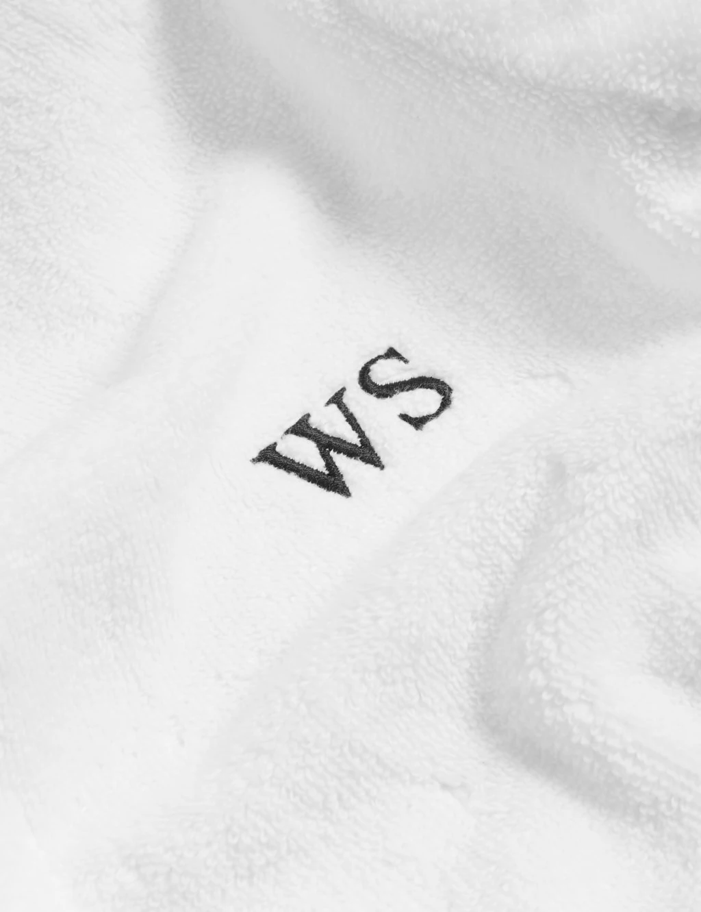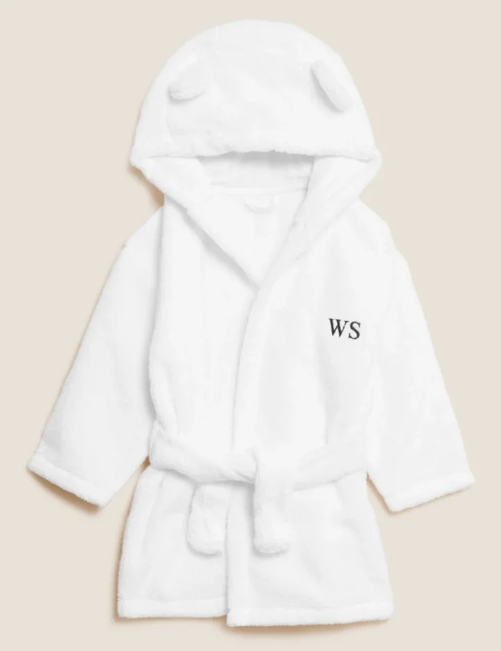 With baby’s initials embroidered in navy thread, this bathrobe makes an extra special present for little ones. Perfect for wrapping them up after bathtime, it’s made from absorbent pure cotton towelling and features a tie fastening. A large hood with pop-out ears adds the cute factor. We only ever use responsibly sourced cotton for our clothes.