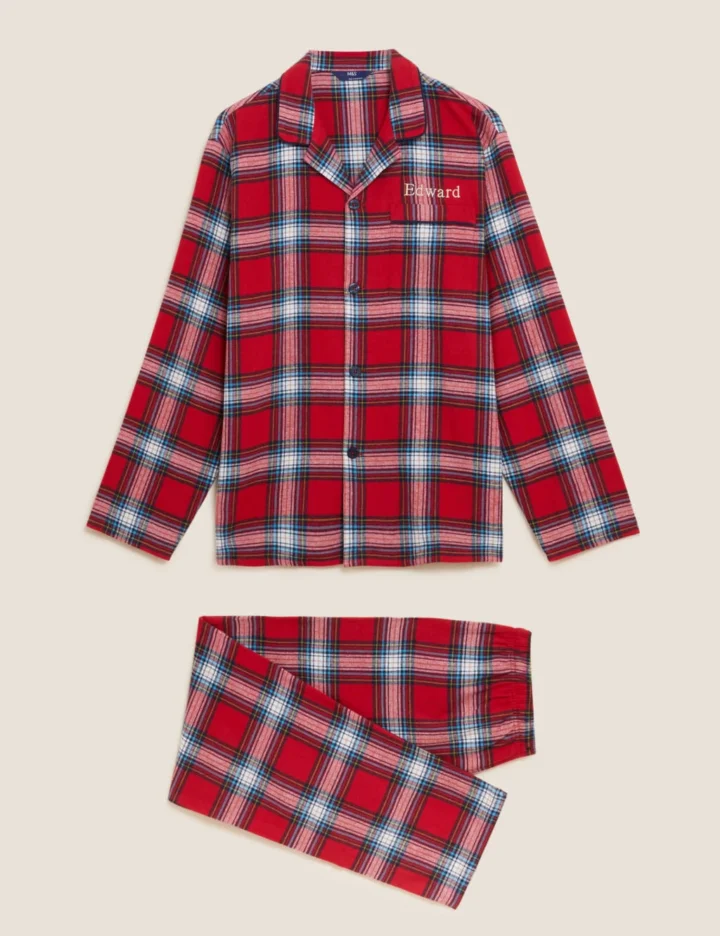Add your loved one’s name in gold embroidery to these checked pyjamas for a personalised gift. They’re cut in a comfy regular fit from soft brushed cotton. The long-sleeved shirt has a classic revere collar, button closure and handy chest pocket. Team with the matching bottoms which have a flexible stretchy waist, timeless mock fly and practical side pockets.