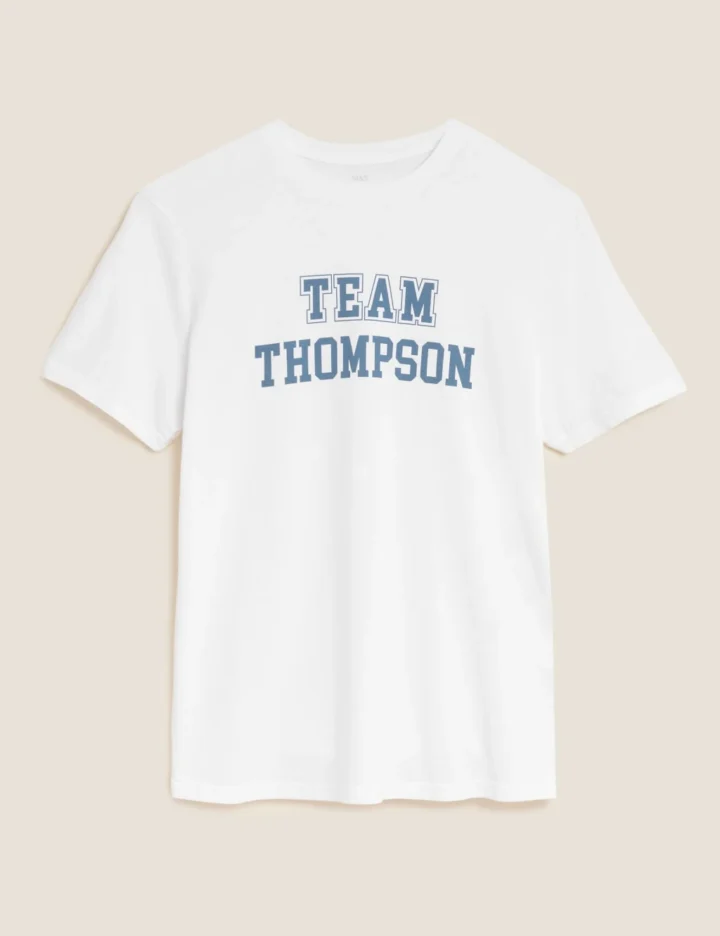 Kit the whole family out in this personalised pure cotton unisex t-shirt, digitally printed with your surname in navy. Comfy regular fit. Large ‘Team’ slogan on the front with room for your family name underneath. Matching kids’ tee available too. Made with organic cotton.