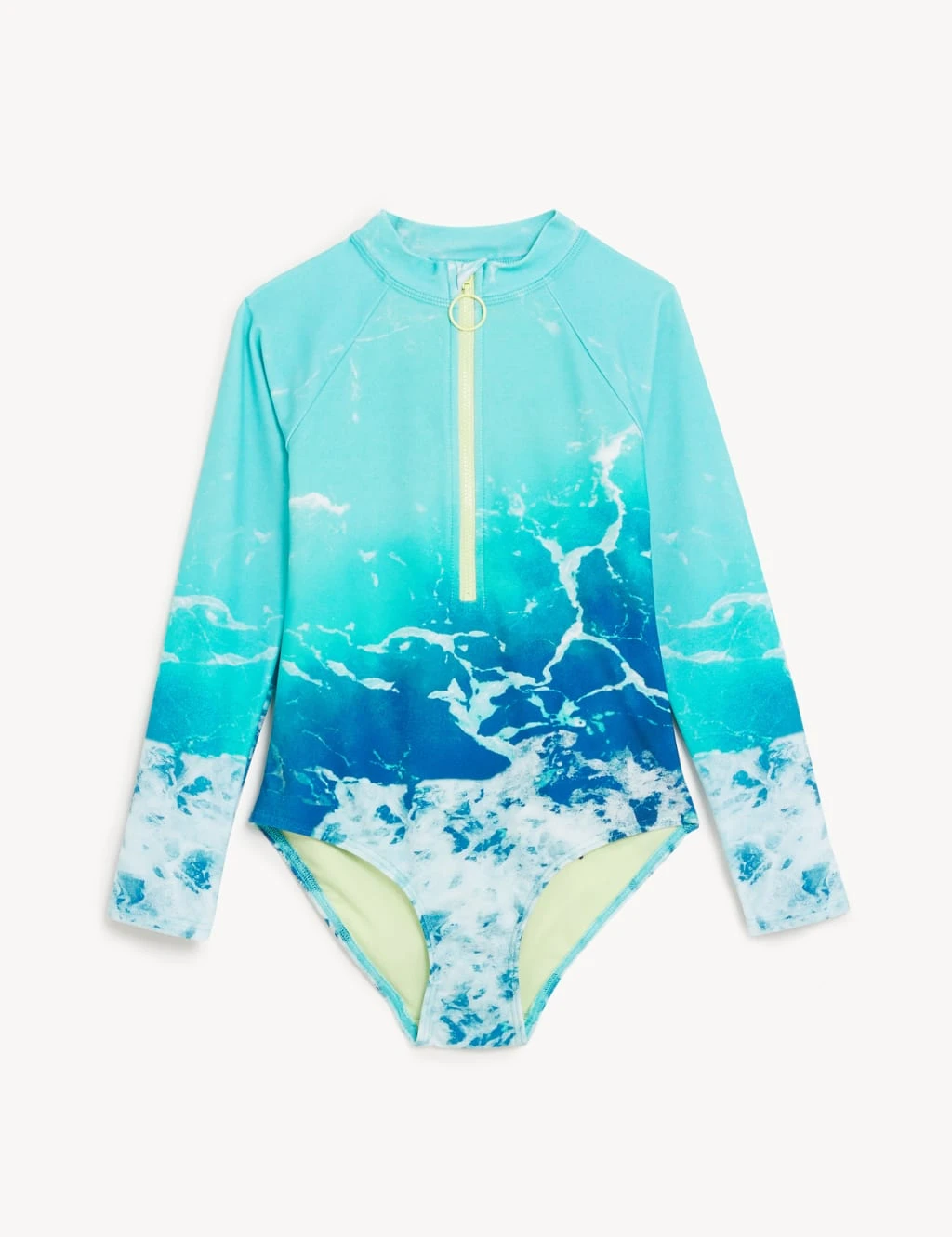 A photographic sea print makes this swimsuit ideal for splashing around at the beach. Regular fit, with added stretch for comfort. UPF 50+ Sun Smart fabric endorsed by the British Skin Foundation and long sleeves help to protect them from harmful rays. Made from durable chlorine-resistant fabric.