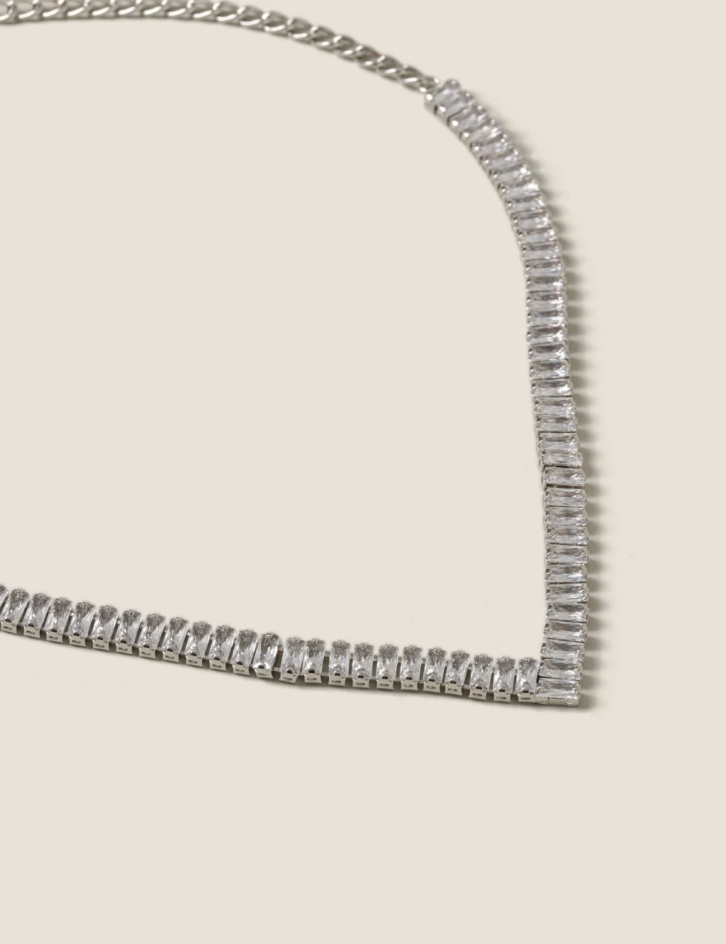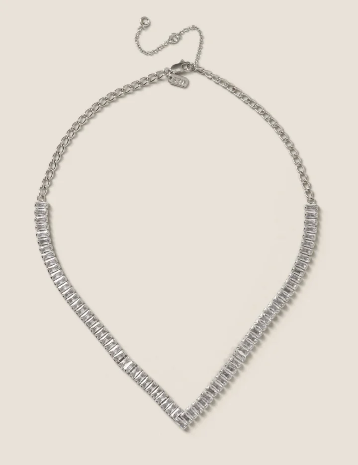 This platinum plated baguette cubic zirconia necklace a perfect statement piece to love and cherish for many years to come.