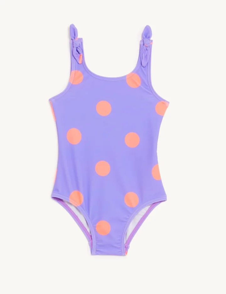 Kids will make a splash in this bold polka dot swimsuit. Made from chlorine-resistant fabric that will keep its shape. Sun Smart UPF50+ helps protect skin from harmful UV rays.