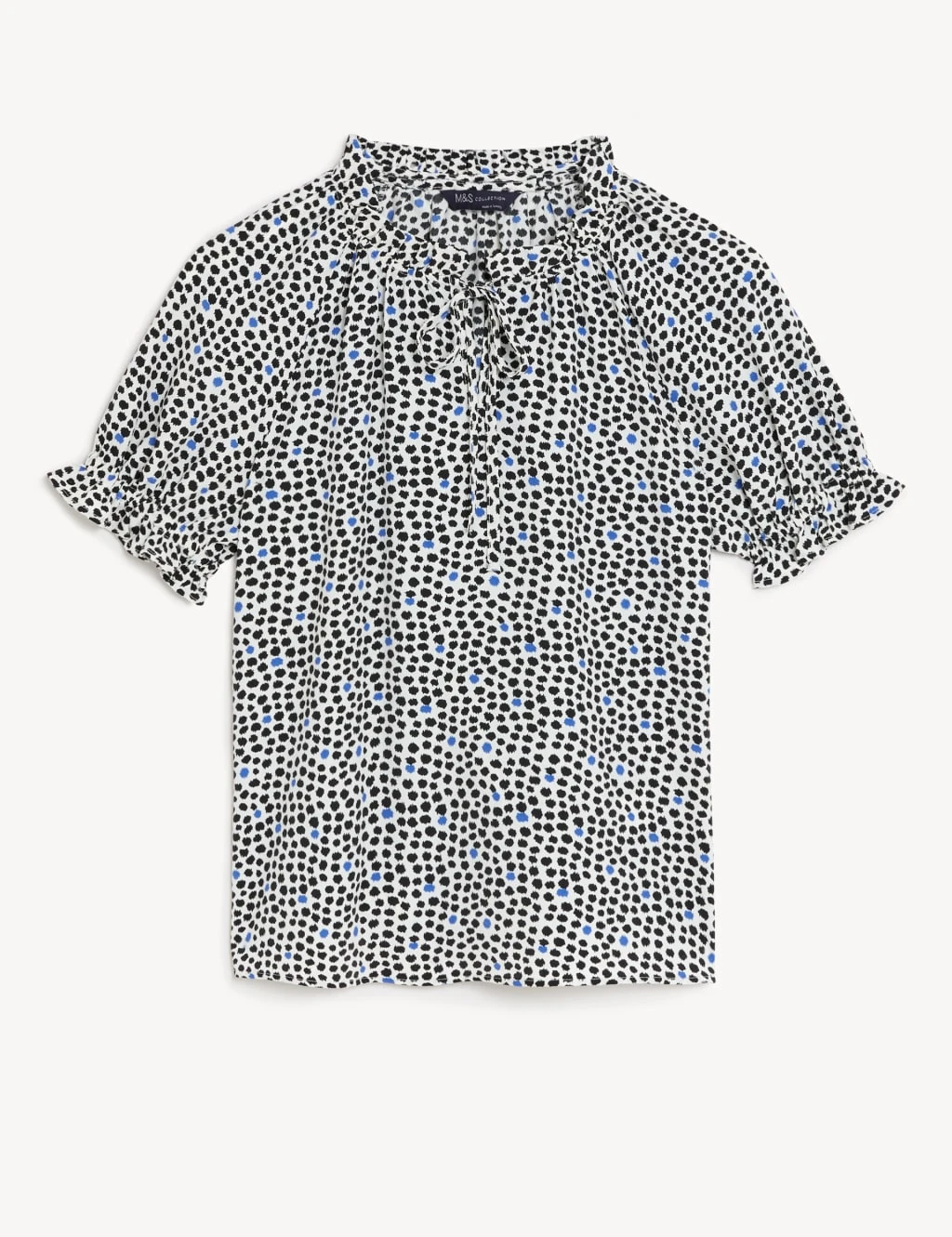 This polka dot blouse makes a striking impression with its elegant tie neck and ruffled trim. It’s designed in a classic regular fit, with short gathered sleeves that end in pretty frilled cuffs.
