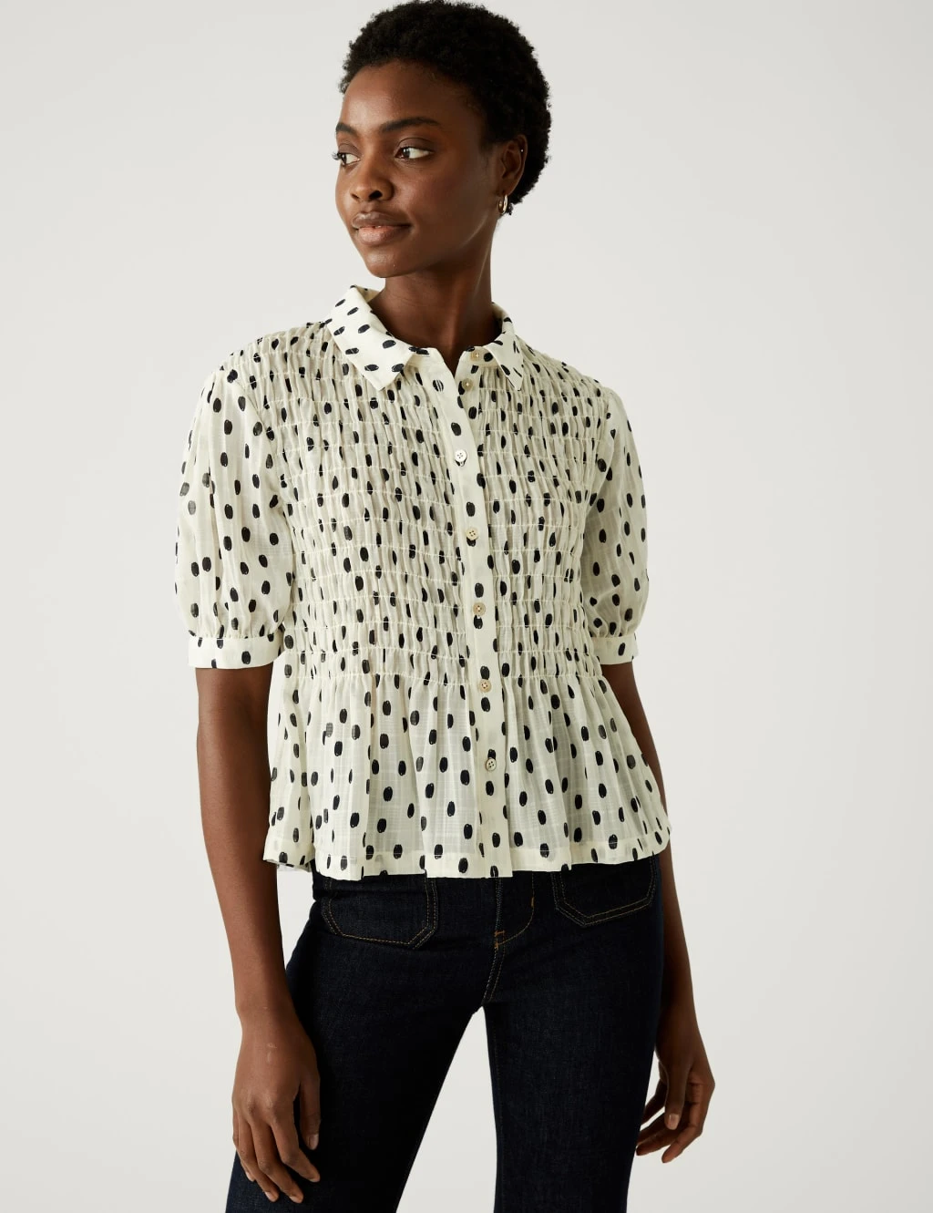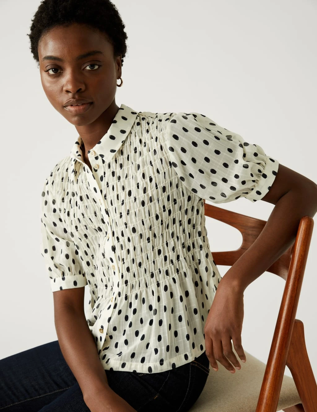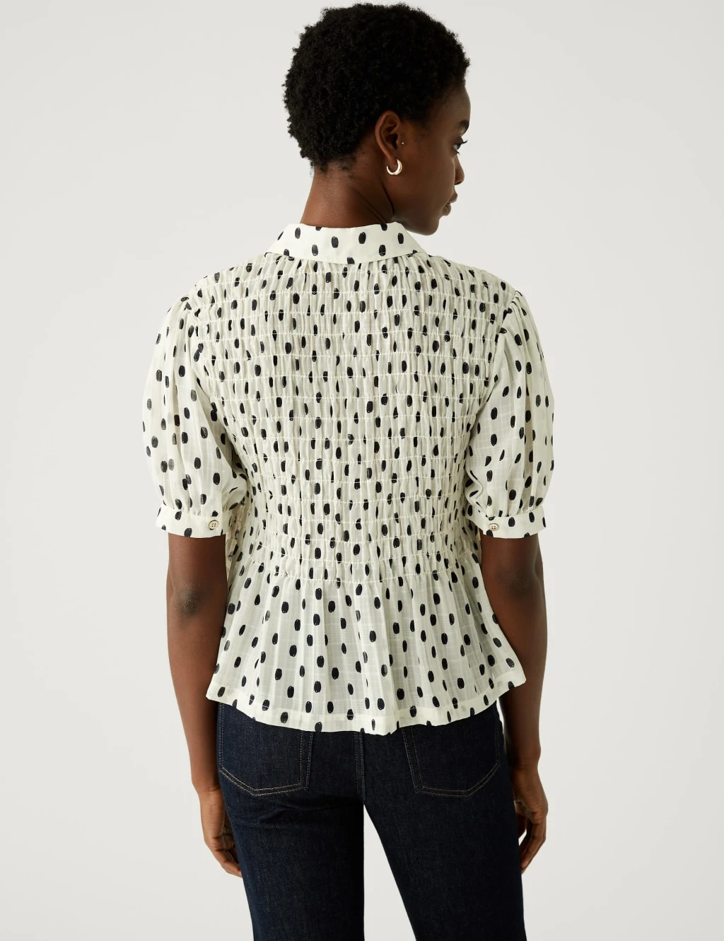 Bring a playful pop to your look with this printed blouse. Regular fit, with a shirred body and a peplum hem for flattering shaping. Short puff sleeves offer a touch of airy volume, while a collared neckline and button-down front create a neat look.