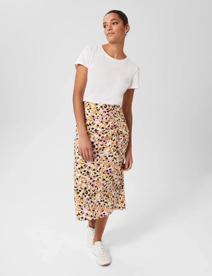 A ruched seam at the side with an elegant ribbon tie adds striking detail to this A-line skirt from Hobbs. It’s cut in a regular fit with a versatile midi length. The elasticated waist is comfortable to wear, while the gathering creates a flattering effect on the front. A vibrant print gives this piece a stand-out look.