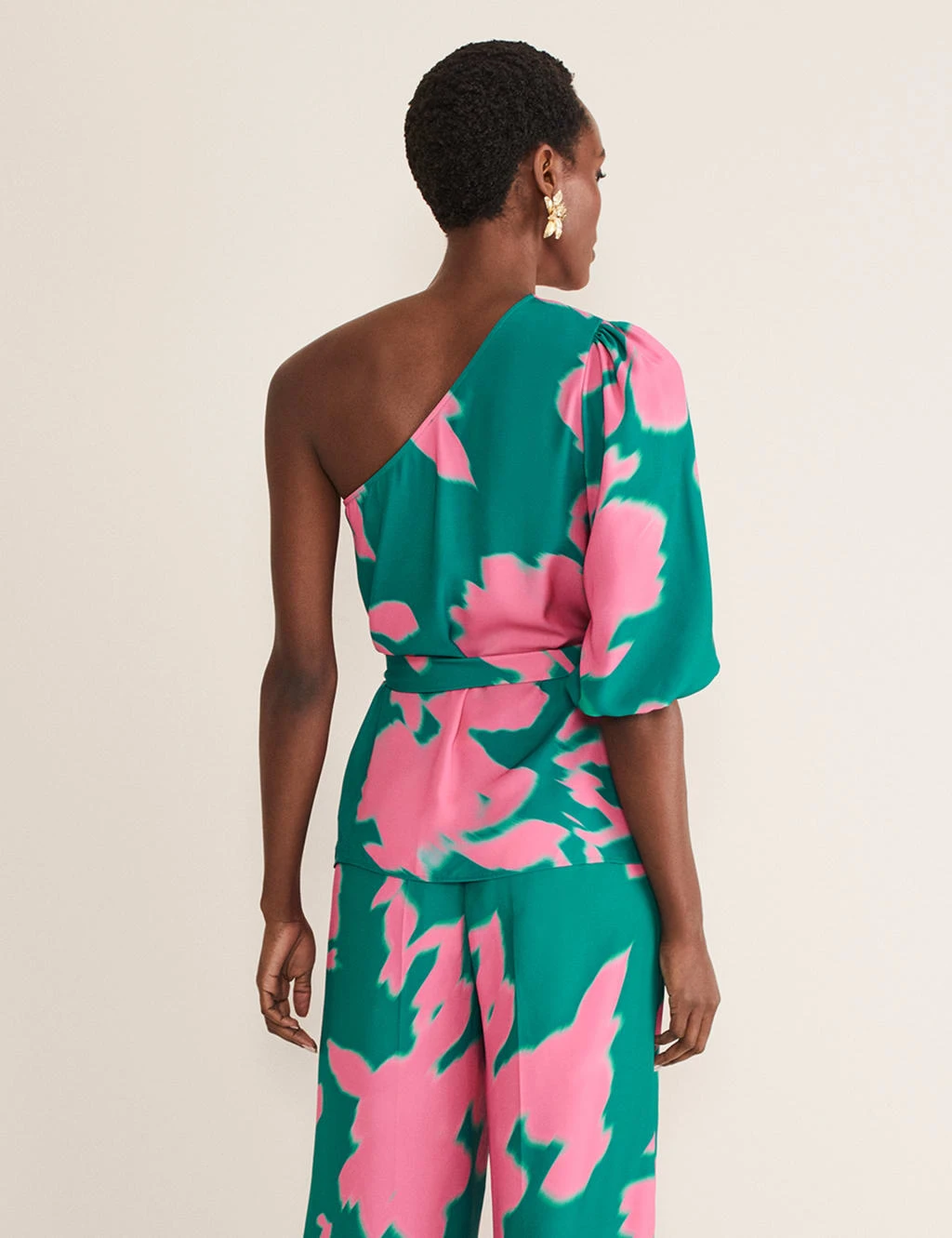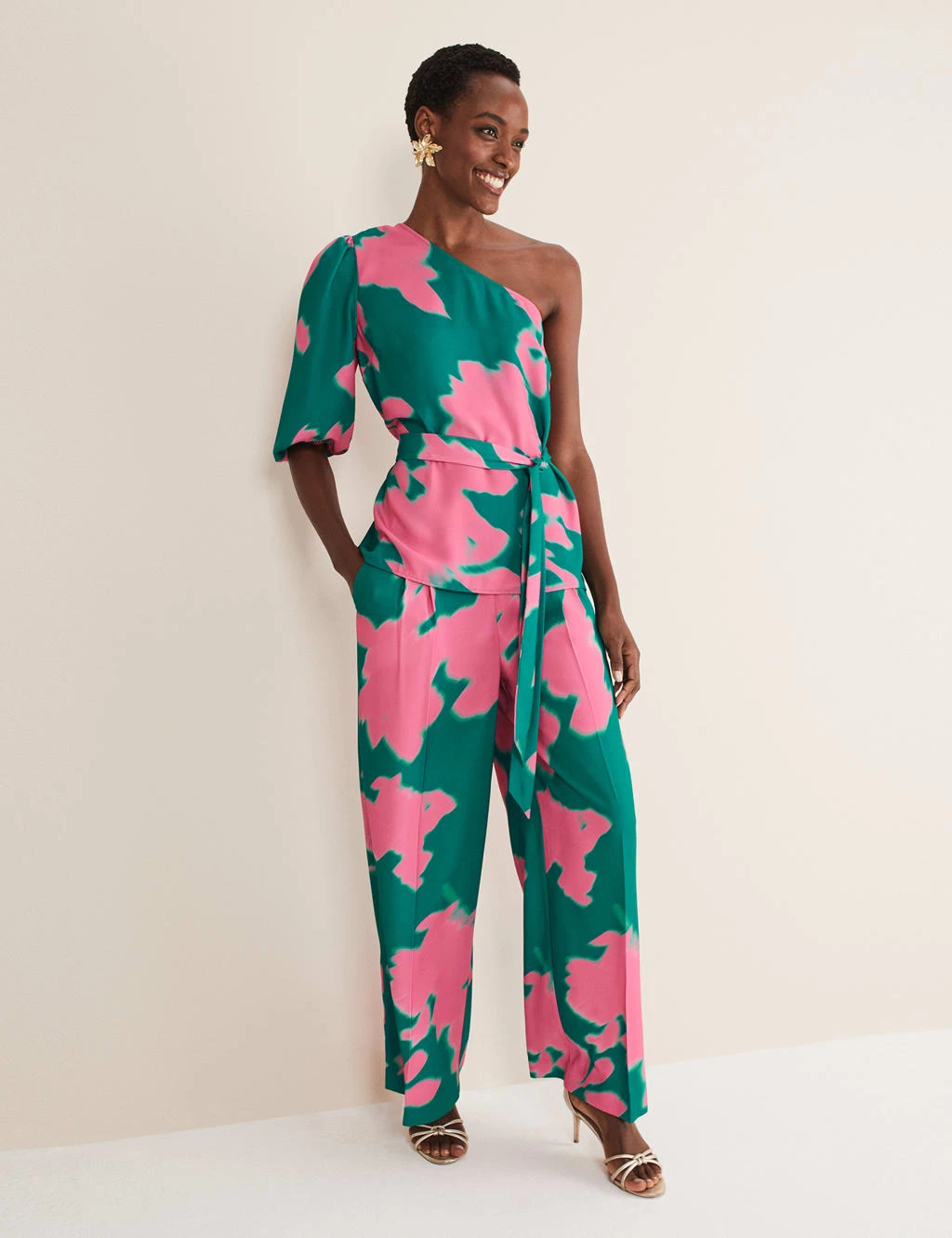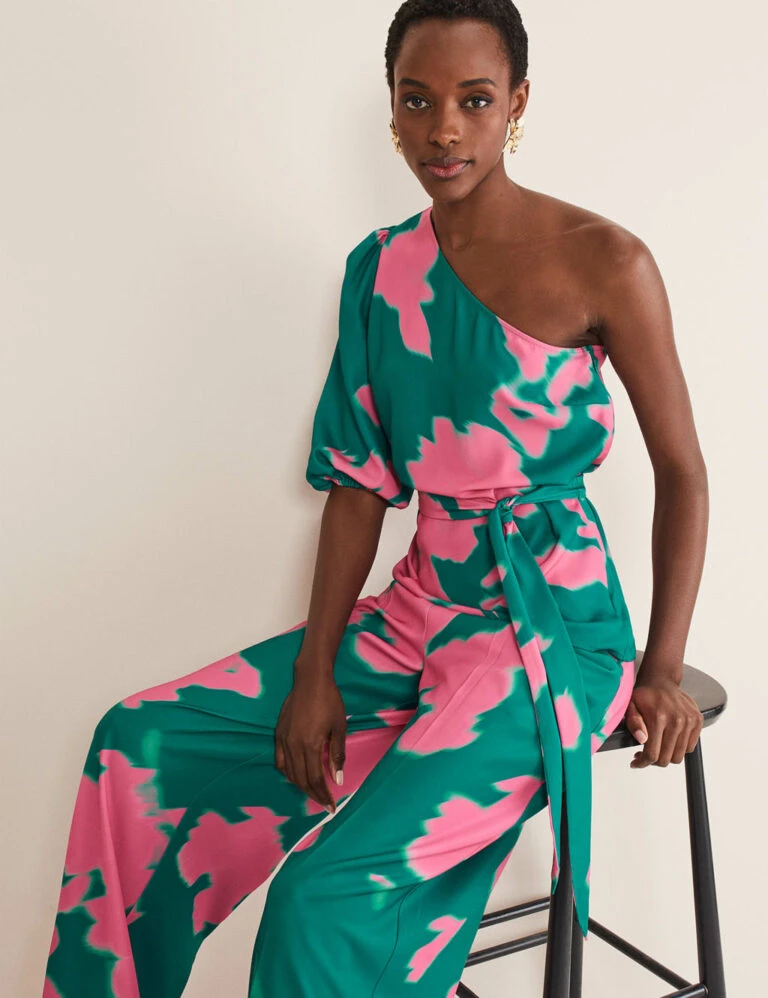 With its standout one-shoulder design and bold abstract print, this Phase Eight blouse makes a striking occasionwear choice. It’s cut in a comfy regular fit, with a self-tie belt to pull you in at the waist. The single three-quarter sleeve is gathered at the shoulder and the cuff for an on-trend blouson silhouette. This piece fastens with a discreet side zip.