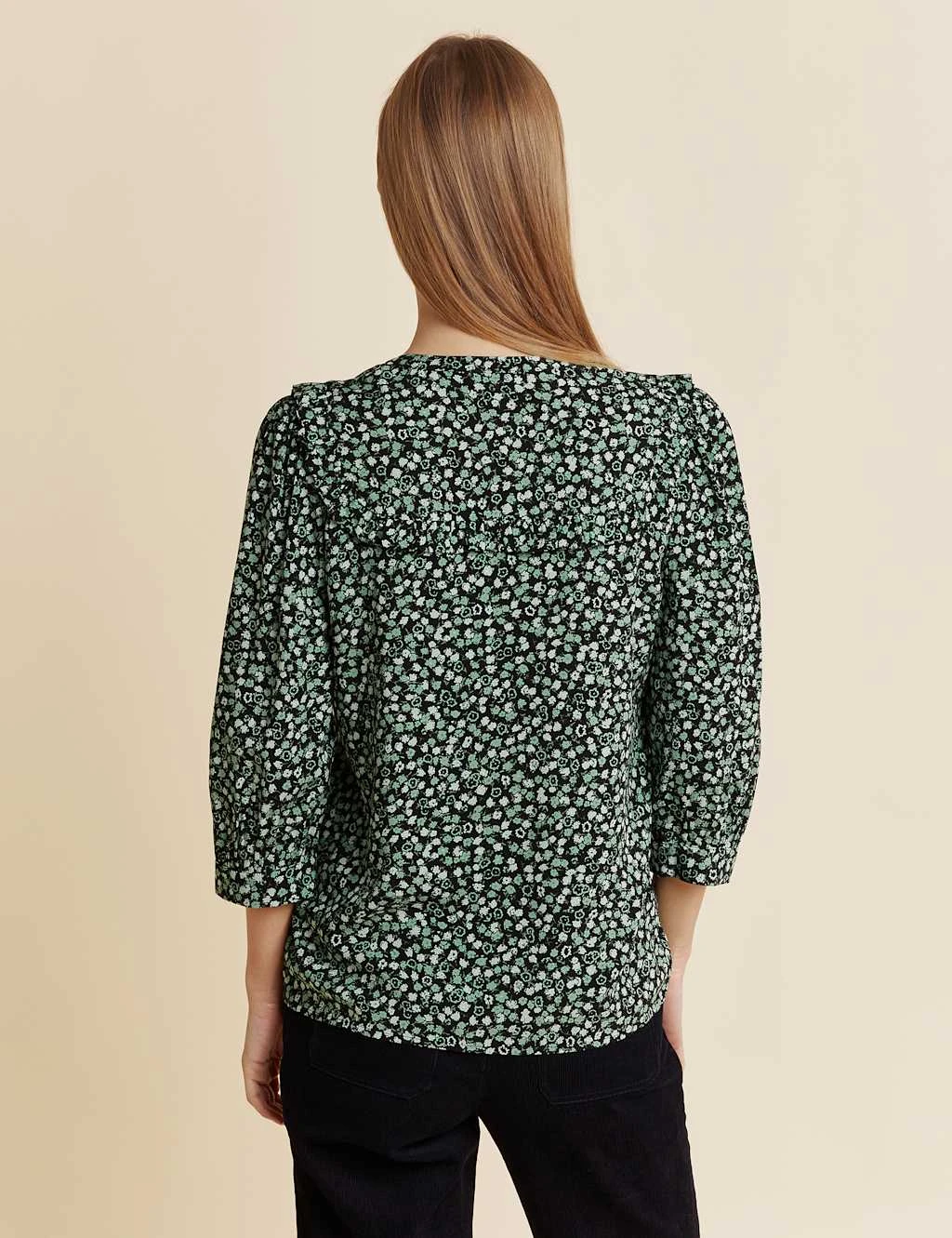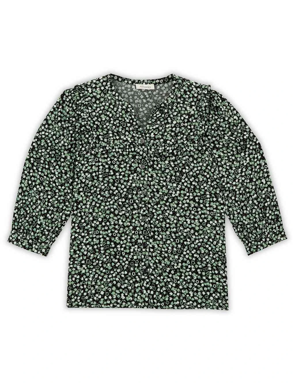 Create an effortlessly elegant look with this striking printed blouse from Albaray. The button-through design is cut in a comfortable regular fit, with gently full three-quarter sleeves and a timeless v-shaped neckline. A pretty ruffle frames the front and back yokes for a feminine flourish.