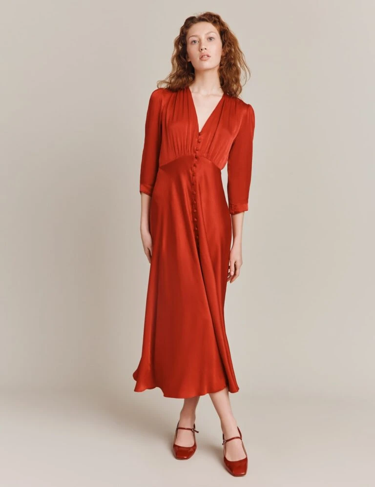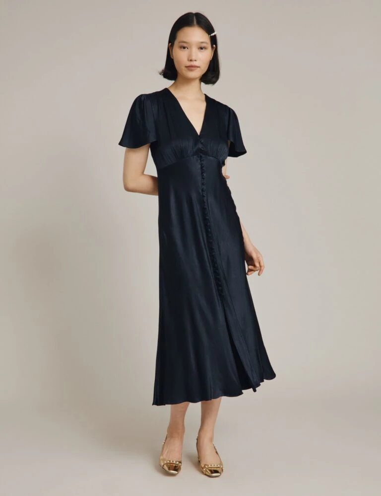 Ghost Satin V-Neck Button Front Midi Waisted Dress