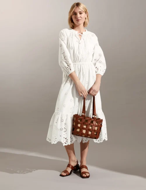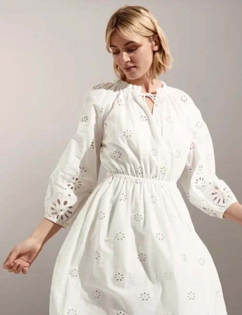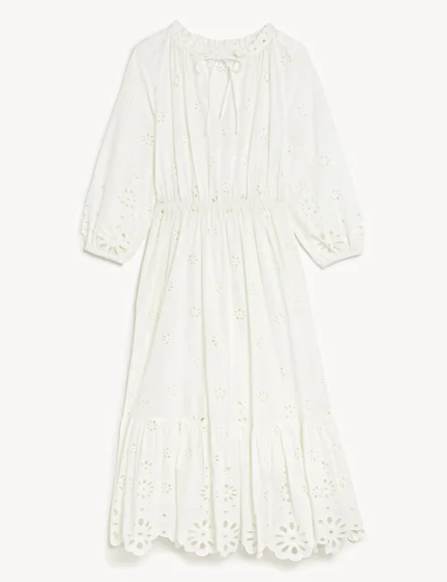 Jaeger Pure Cotton Broderie Tie Neck Midi Dress