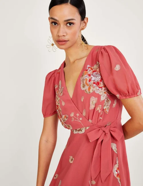 MONSOON Embroidered V-Neck Midi Wrap Dress