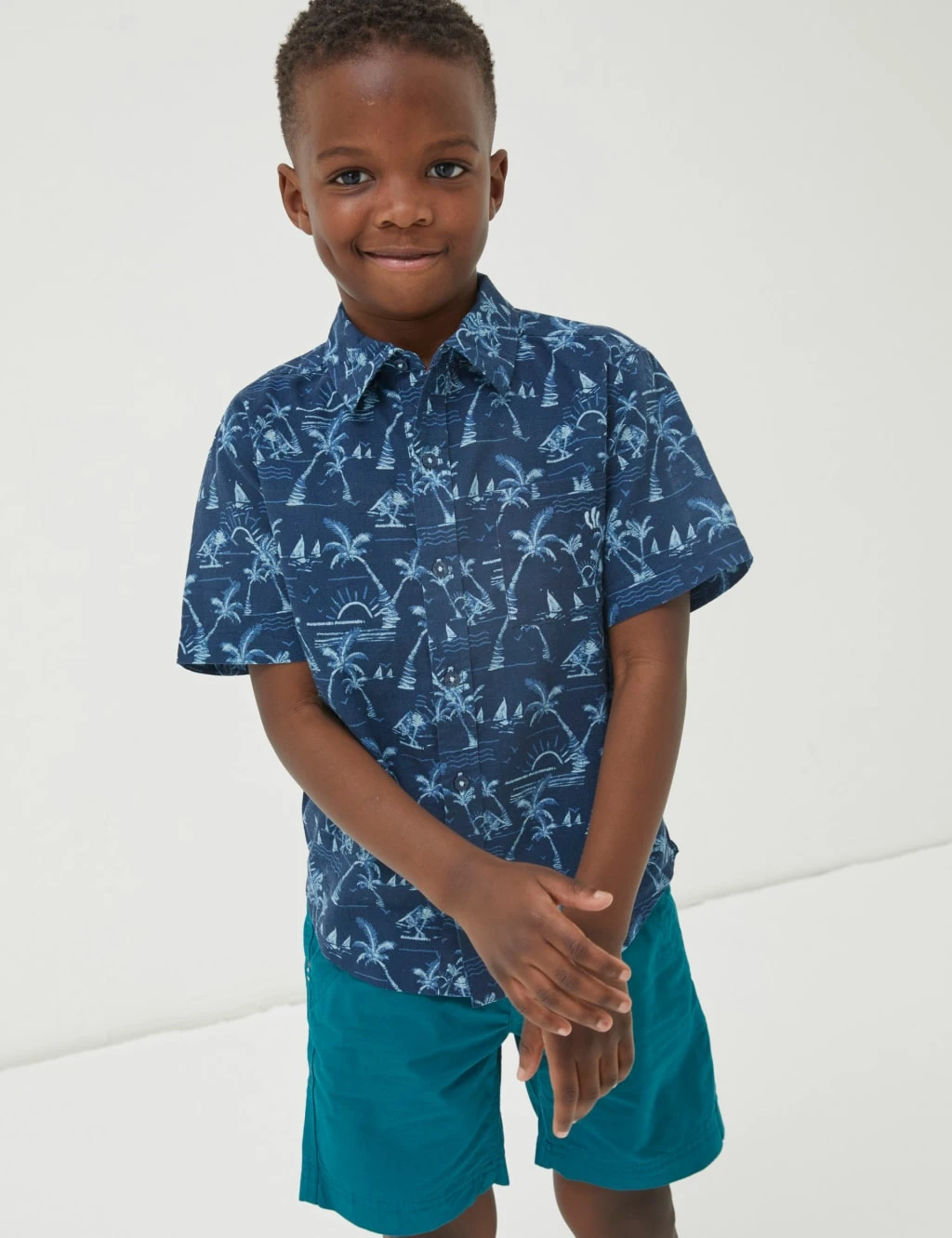 Dress them up for smarter occasions in this pure cotton FatFace shirt. The button-through style is cut in an easy regular fit and features a collared neckline and airy short sleeves. An all-over print of boats and palm trees adds a tropical finish.