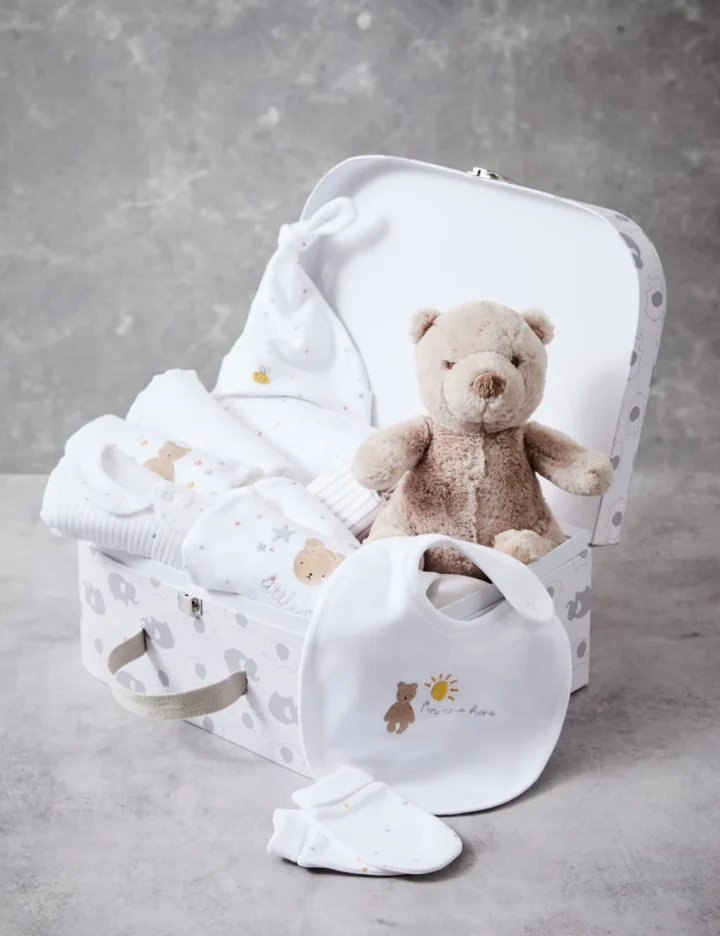 Welcome a newborn with this gift set comprising pure cotton babywear essentials and a cute cuddly toy. Packed into the elephant-decorated box are various items to see little one through their first few months, from bibs and a hat to soft, snuggly blankets. Stars, teddy bears and slogans such as ‘I’m new here’ adorn the pieces for an adorable touch. Plus, the teddy toy has ‘Born in 2023’ stitched into a paw, making it the perfect keepsake.