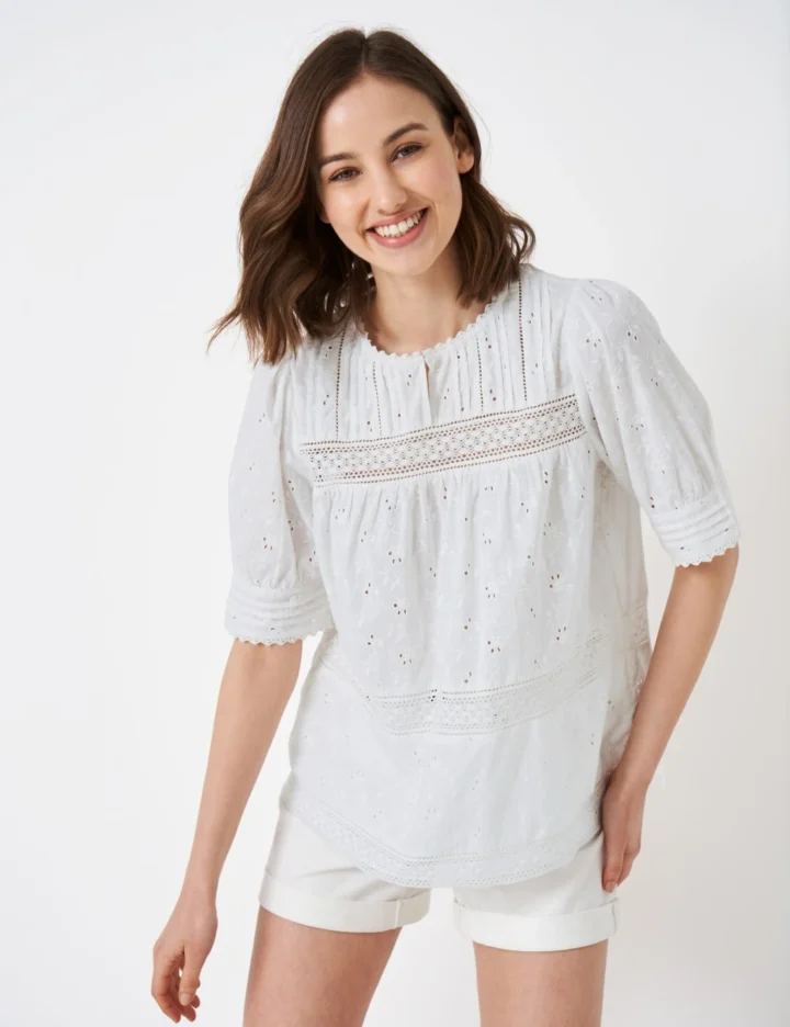 This pure cotton blouse by Crew Clothing is made for sunny days. Cut to an effortless regular fit, it features a keyhole button fastening on the crew neckline, plus short puff sleeves. It’s beautifully detailed with a mix of broderie, ladder lace and scalloped trims.