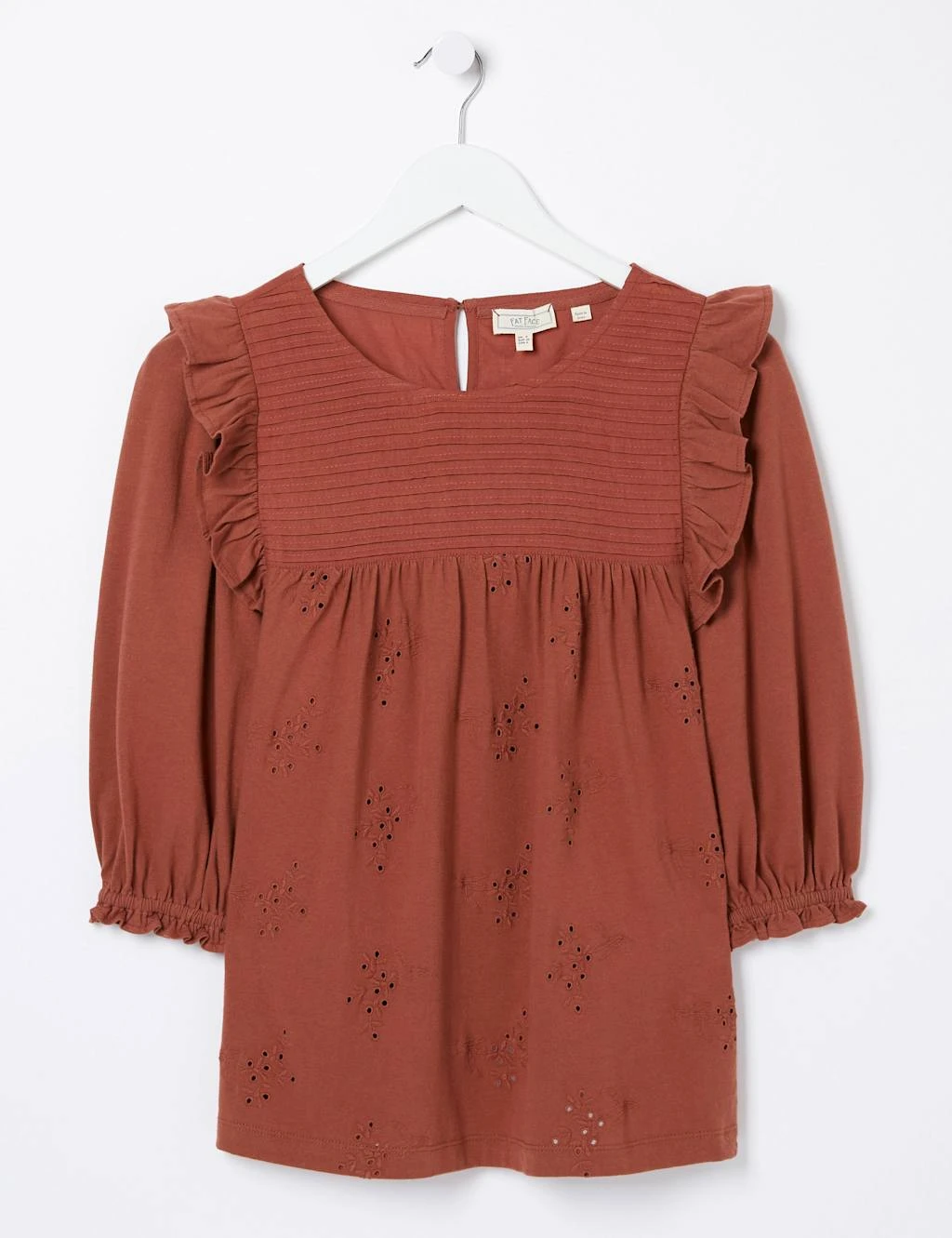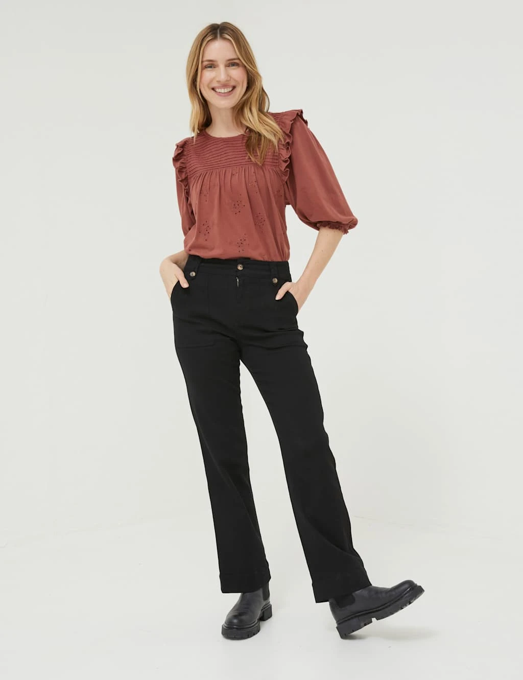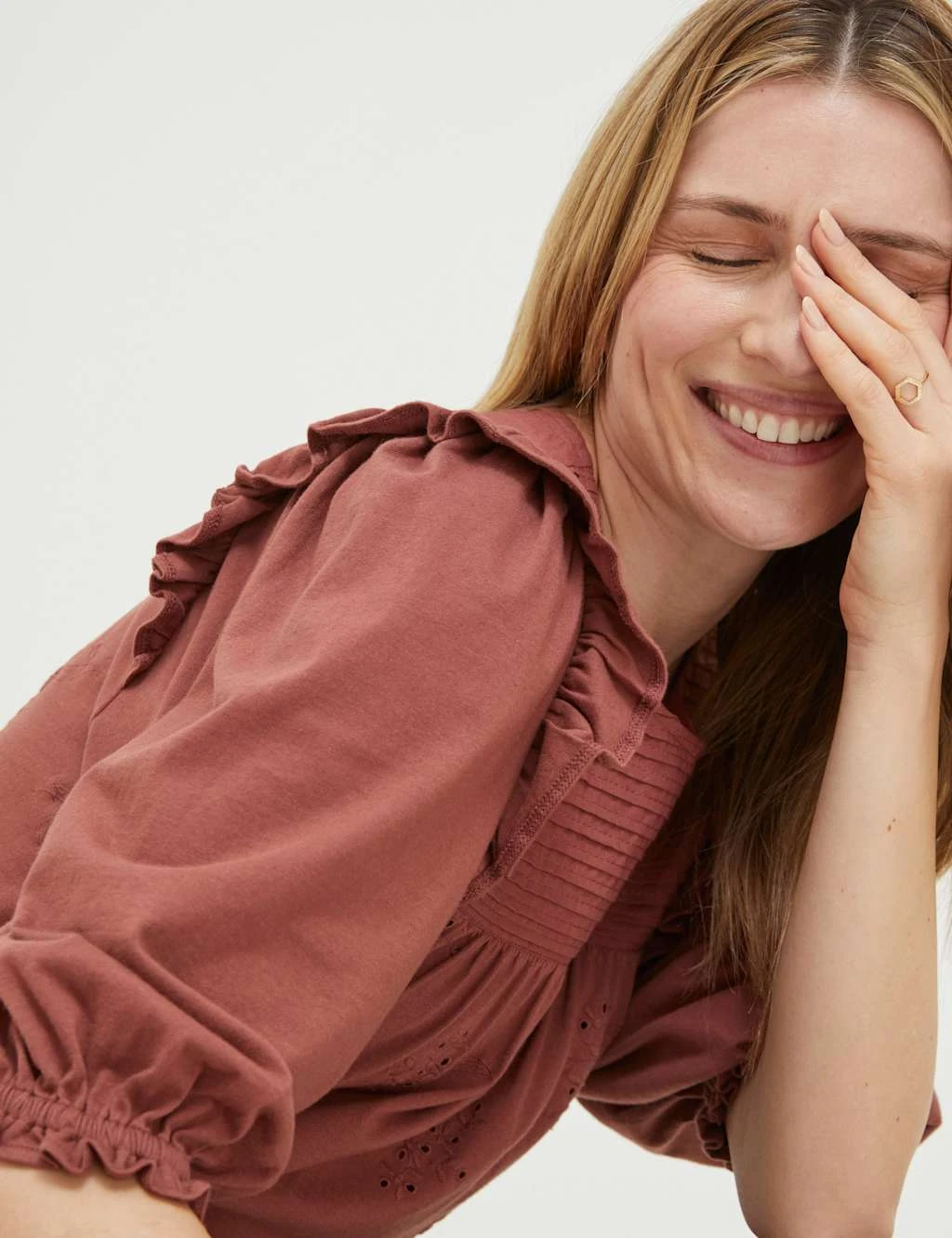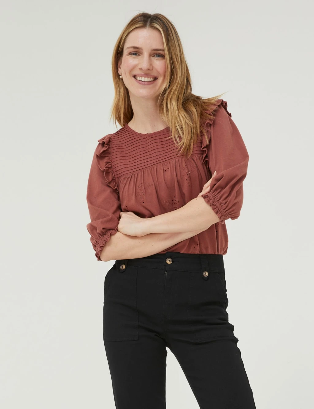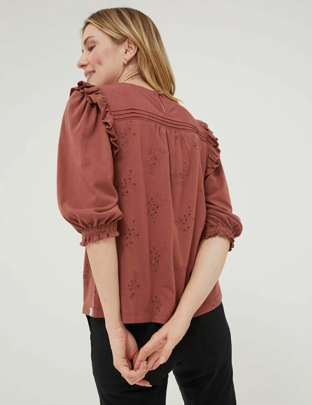 Enjoy the feminine details of this FatFace blouse, crafted from breathable pure cotton. Cut to a comfortable regular fit, the crew-neck piece features pretty pintuck detailing at the shoulder yoke and broderie through the body. Gently full three-quarter sleeves feature frills at the shoulders and gathered cuffs.